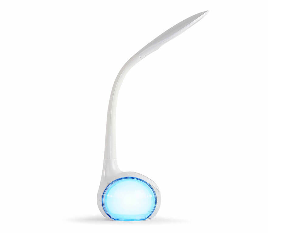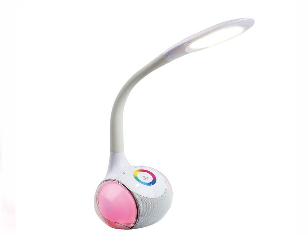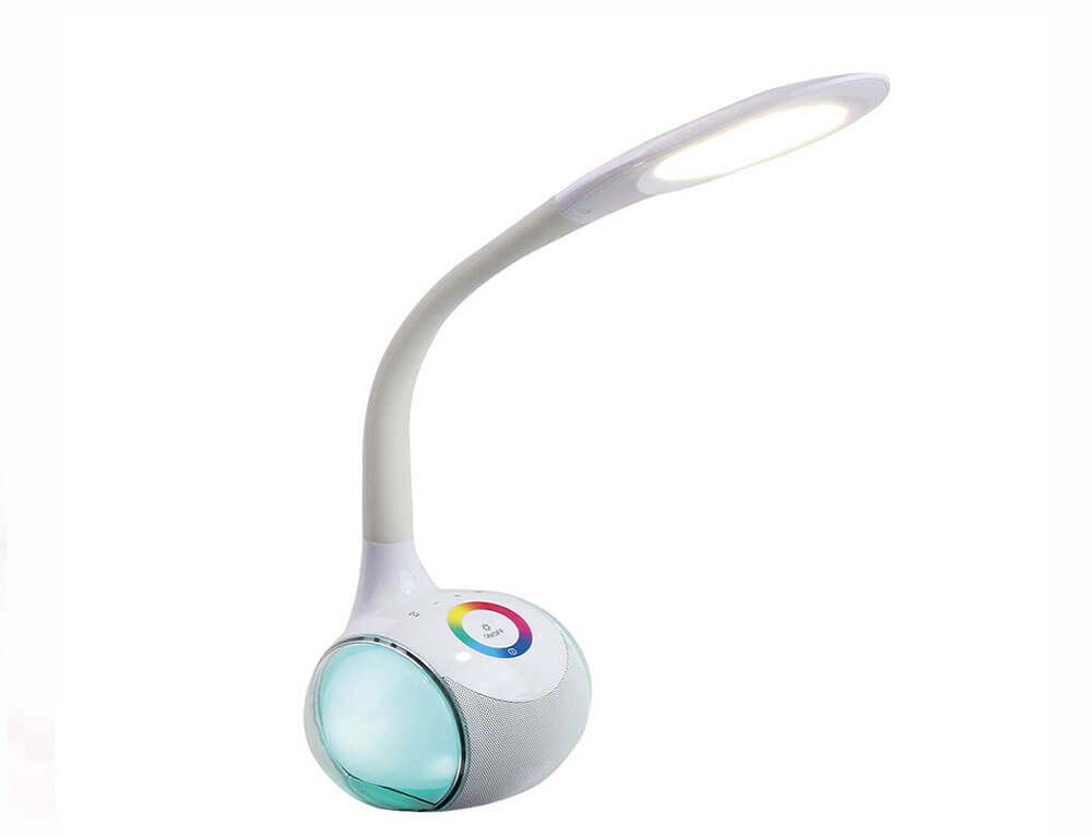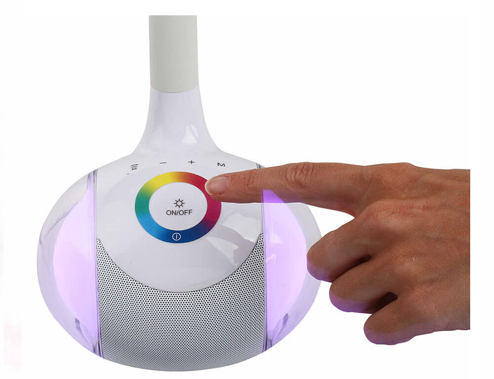 Λάμπα LED, με συμβατό ηχείο Bluetooth, μικρόφωνο για κλήσεις με θύρα USB για ανάγνωση μορφής MP3 και επαναφόρτιση όλων των τύπων συσκευών, συμβατή με Smartphone, iPhone, tablet και υπολογιστή, ηχείο 5 W, χειριστήριο αφής, 3 λειτουργίες φωτισμού LED, ρυθμιζόμενος λαμπτήρας σιλικόνης, λειτουργίες αλλαγής χρωμάτων και εύρος 10 μέτρων.