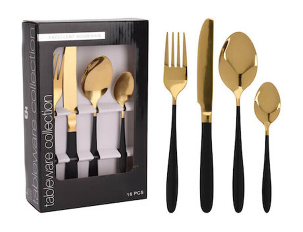 Εικόνα Σετ Μαχαιροπίρουνα Excellent Houseware ανοξείδωτα Χρυσά με μαύρη λαβή - 16τμχ