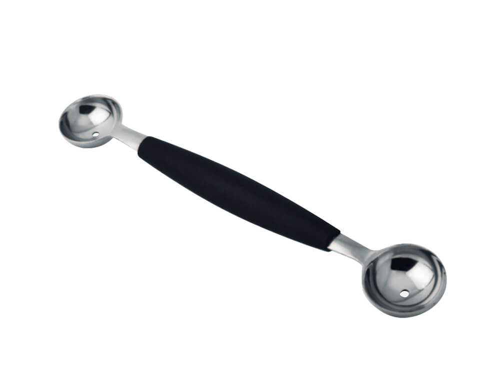 Με αυτό το εργαλείο κοπής μπορείτε να κόψετε φρούτα ή πατάτες ή ότι άλλο επιθυμείτε σε κομμάτια με σχήμα μπάλας. Οι δύο άκρες έχουν διαφορετικό μέγεθος και είναι αιχμηρές για να εξασφαλίσουν καλύτερη εξαγωγή. Διαθέτει πλαστική λαβή, η οποία είναι αντιολισθητική και εργονομική ώστε να μπορείτε να κόβετε με περισσότερη άνεση και ευκολία. Είναι κατασκευασμένο από ανοξείδωτο ατσάλι και μπορεί να πλυθεί σε πλυντήριο πιάτων.