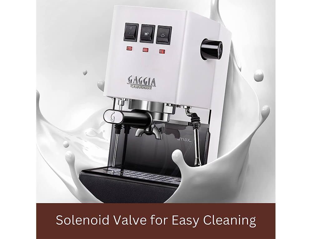 - Ηλεκτρομαγνητική βαλβίδα 3 κατευθύνσεων, εξασφαλίζει σταθερό έλεγχο της πίεσης του νερού στο κλείστρο και την ευκολότερη αφαίρεση και καθαρισμό του καφέ από το κλείστρο, αφού ολοκληρωθεί η διαδικασία εκχύλισης