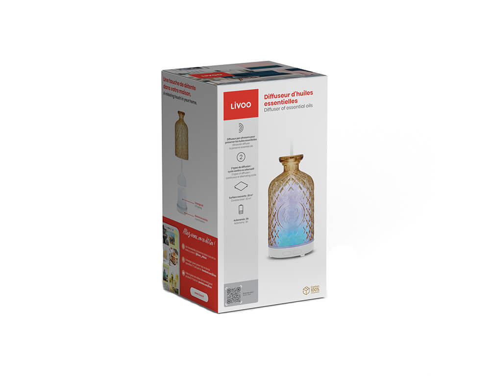 Δώστε μια πινελιά χαλάρωσης στο σπίτι σας με τον διαχυτή αιθέριων ελαίων της εταιρείας Livoo. Ο γυάλινος διαχύτης υπερήχων είναι επίσης ένας διαχύτης ύγρανσης, επιτρέπει την τέλεια διάχυση των αρωμάτων των αιθέριων ελαίων, ενώ παράλληλα δημιουργεί ατμόσφαιρα χάρη στην επιλογή του χρώματος διάχυσης. Υπάρχει επιλογή μεταξύ δύο επιπέδων διάχυσης, συνεχούς ή διακοπτόμενου με κύκλο που εναλλάσσεται 25 δευτερόλεπτα διάχυσης και 10 δευτερόλεπτα σε παύση. Διαθέτει τρία αντιολισθητικά πόδια και κουμπιά ελέγχου, ενώ στη συσκευασία περιλαμβάνεται και το καλώδιο φόρτισης USB . Επίσης, διαθέτει εφέ φωτός με μεταβαλλόμενη ή σταθερή λειτουργία φωτός και πραγματοποιείται αυτόματη διακοπή του ατμού όταν η στάθμη του νερού είναι ανεπαρκής.