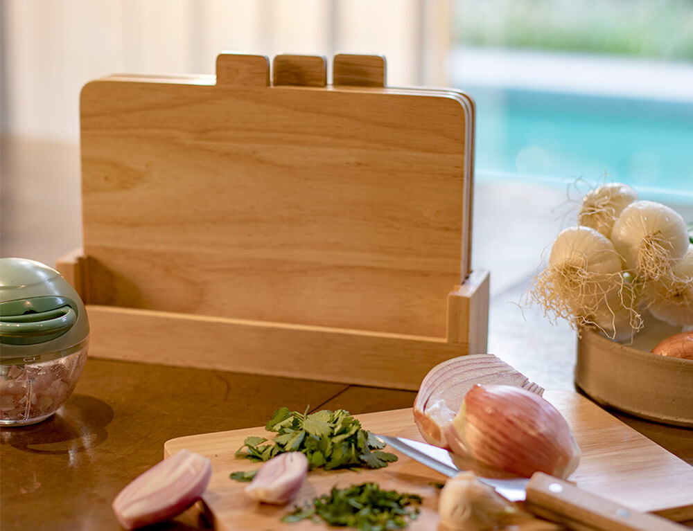 Το σετ με τους δίσκους κοπής της Livoo αποτελείται από τέσσερις επιφάνειες κοπής και μια ξύλινη βάση στήριξης. Για να μπορείτε να εργάζεστε υγιεινά στην κουζίνα, καλό είναι να χρησιμοποιείτε διαφορετικές επιφάνειες κοπής. Κάθε επιφάνεια έχει σχεδιαστεί για την κοπή διαφορετικών προϊόντων, όπως λαχανικά, πουλερικά, κρέας και ψάρι.