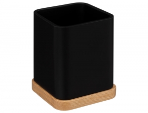 Δοχείο για κρεμοσάπουνο σε μαύρο χρώμα και μοντέρνο σχεδιασμό με λεπτομέρειες από ξύλο μπαμπού. Κατασκευάζεται από πλαστικό, το οποίο είναι πολύ ανθεκτικό στην υγρασία αλλά και παρουσιάζει παράλληλα μεγάλη αντοχή στον χρόνο.
