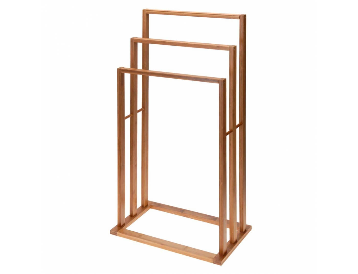 Η άνετη κρεμάστρα για πετσέτες είναι κατασκευασμένη από μπαμπού που προσφέρει φυσική και ζεστή εμφάνιση και είναι απόλυτα κατάλληλη για εντατική χρήση. Το μπαμπού είναι γνωστό για την αντοχή του στην υγρασία και τις διακυμάνσεις της θερμοκρασίας, δίνοντας τη δυνατότητα σε αυτή τη σχάρα για πετσέτες ιδανική για να κρεμάτε ή να στεγνώνετε πετσέτες στο μπάνιο σας και κατά συνέπεια δεν χρειάζεται να ανοίξετε περιττές τρύπες στους τοίχους. Η φανταχτερή θήκη για πετσέτες από μπαμπού με 3 μπάρες στη βάση θα κάνει σίγουρα μια εντυπωσιακή προσθήκη στον χώρο σας!