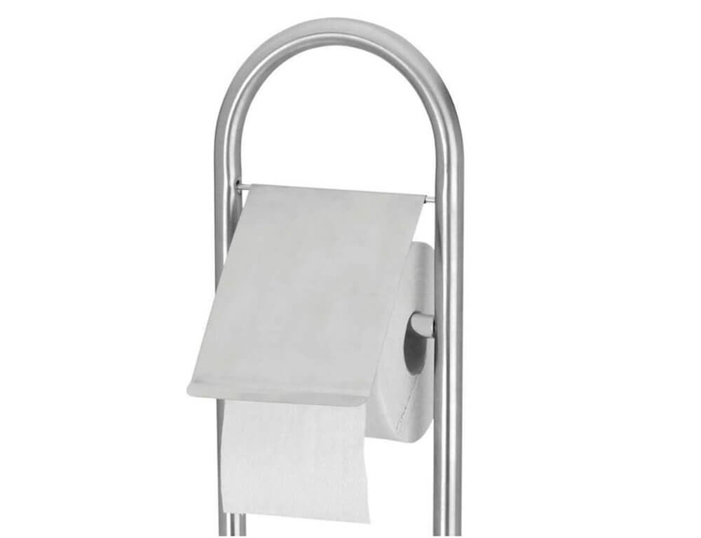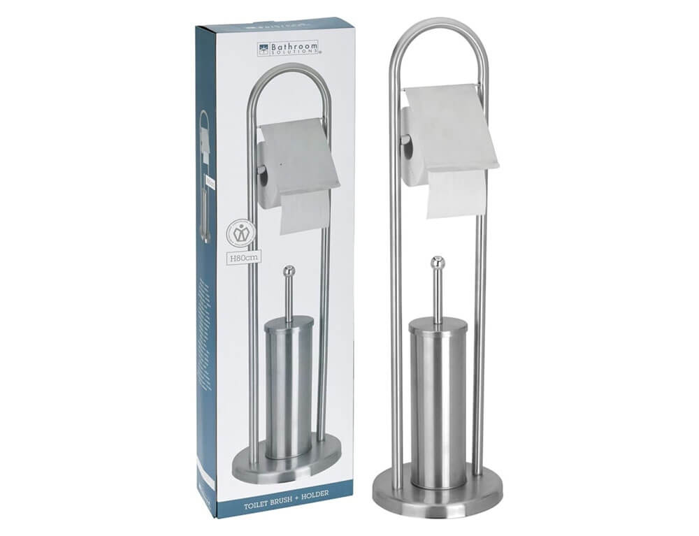 Βάση μεταλλική με βούρτσα τουαλέτας (πιγκάλ) και θέση για χαρτί υγείας (χαρτοθήκη) σε ασημί χρώμα. Το σετ είναι κατασκευασμένο από ανοξείδωτο ατσάλι με βουρτσισμένο μεταλλικό φινίρισμα, το οποίο προσφέρει έναν συνδυασμό στιβαρότητας και κομψότητας. Η βάση για ρολό τουαλέτας διαθέτει κάλυμμα για να σκίζετε εύκολα το χαρτί υγείας. Ένα εύχρηστο καπάκι είναι στερεωμένο στη λαβή της βούρτσας για να μην φαίνεται η βούρτσα. Τοποθετείται πολύ εύκολα και δεν χρειάζεται να ανοίξετε τρύπες στον τοίχο ή στο πάτωμά σας.