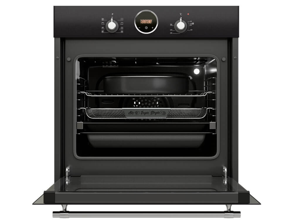 Διαθέτει ένα βαθύ ταψί, ένα ρηχό ταψί, ένα στρογγυλό βαθύ ταψί, μια σχάρα καθώς και ένα airfryer ταψί