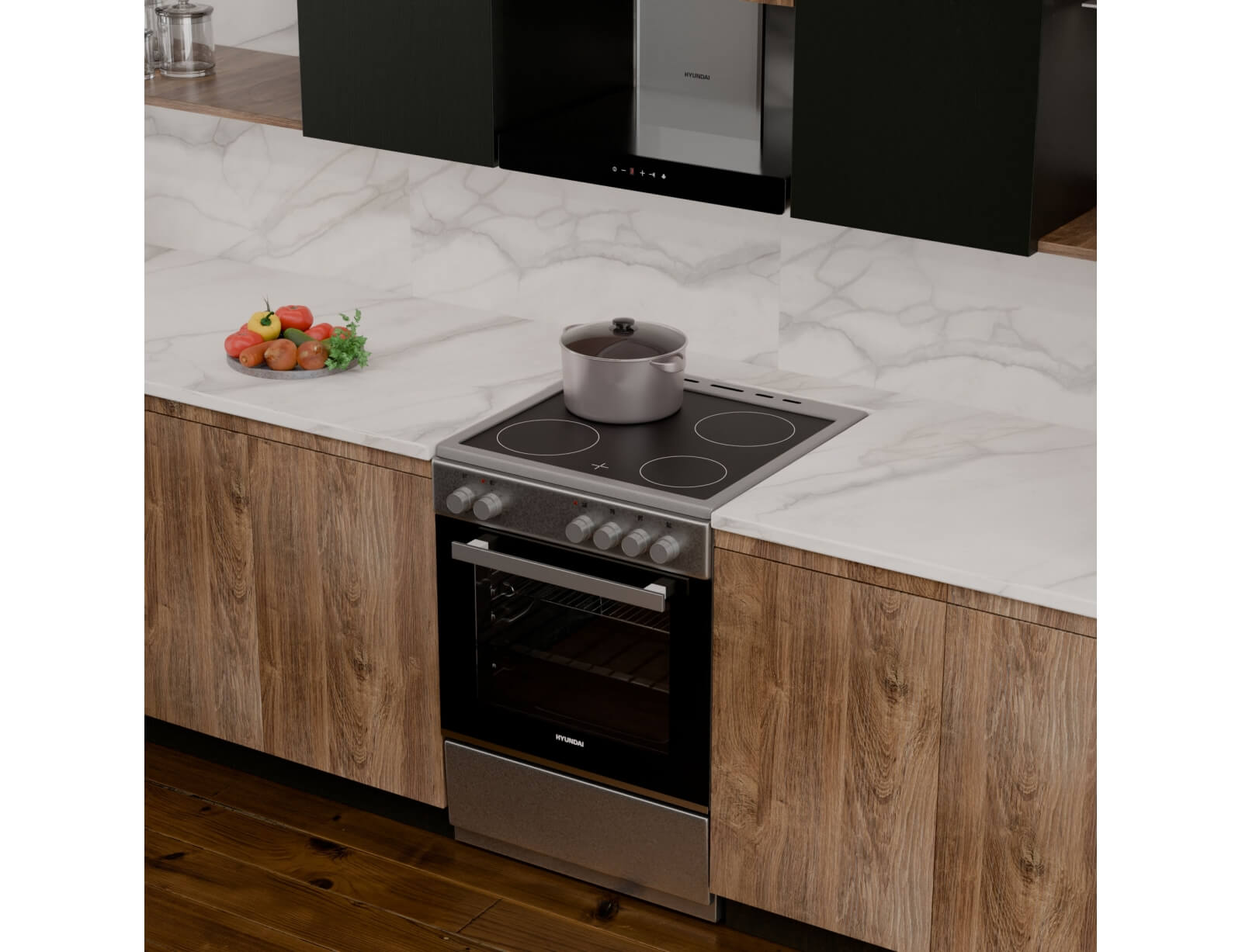 Κουζίνα Hyundai HCVC24V-7260VS/S με μεγάλη χωρητικότητα φούρνου 69 λίτρα, ενεργειακή κλάση Α, 4 κεραμικές εστίες μαγειρέματος και 5 λειτουργίες ψησίματος.