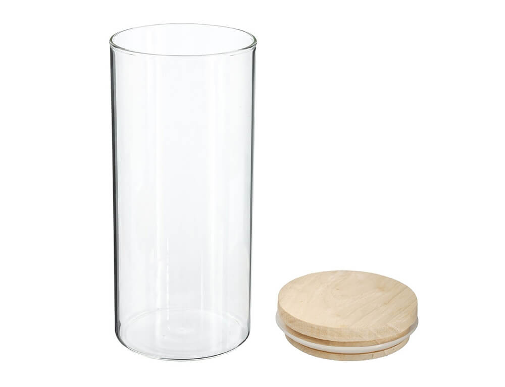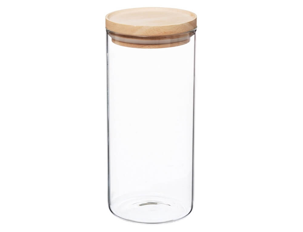 Με το γυάλινο δοχείο τροφίμων μπορείτε να οργανώσετε την κουζίνα σας και να αποθηκεύσετε τρόφιμα ή τα αγαπημένα σας γλυκίσματα. Το καπάκι του είναι κατασκευασμένο από ξύλο και κλείνει αεροστεγώς, με αποτέλεσμα να μην αλλοιώνονται τα τρόφιμα από την υγρασία, τη μούχλα, τη σκόνη και άλλους ρύπους. Επίσης, το φαγητό σας θα παραμείνει πιο φρέσκο με το αρχικό άρωμα για μεγαλύτερο χρονικό διάστημα. To δοχείο είναι κατάλληλο για φούρνο μικροκυμάτων και πλυντήριο πιάτων, αλλά χωρίς το καπάκι.