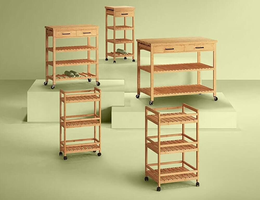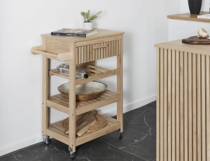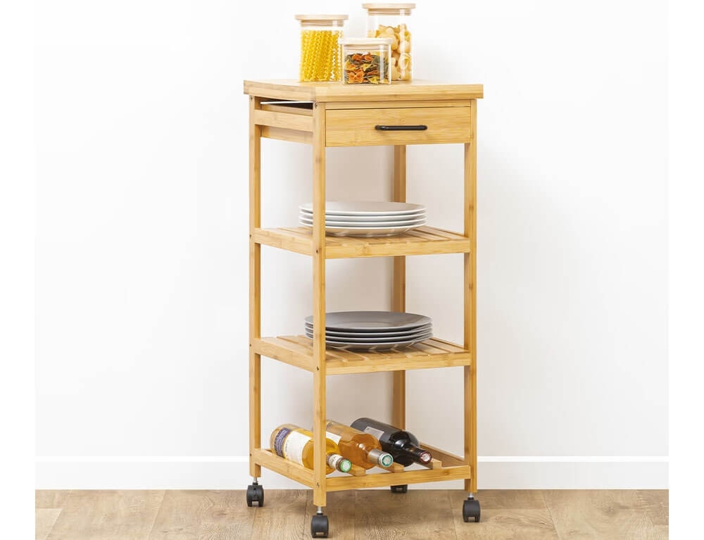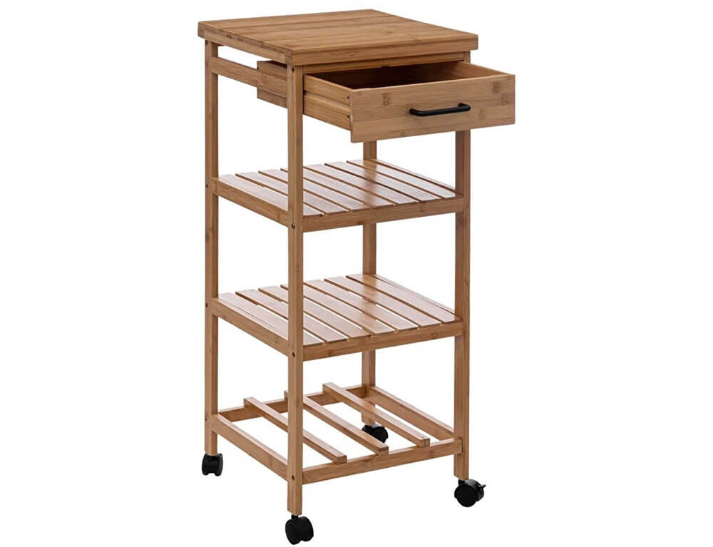 Οργανώστε και τακτοποιήστε το χώρο σας με το τρόλεϊ από την 5five. Διαθέτει 3 ράφια, 1 συρτάρι και είναι κατασκευασμένο από bamboo, το οποίο είναι εύκολο στη συντήρηση, αλλά παράλληλα και ανθεκτικό στις φθορές και τον χρόνο. Διαθέτει 4 ρόδες για πιο εύκολη μεταφορά.