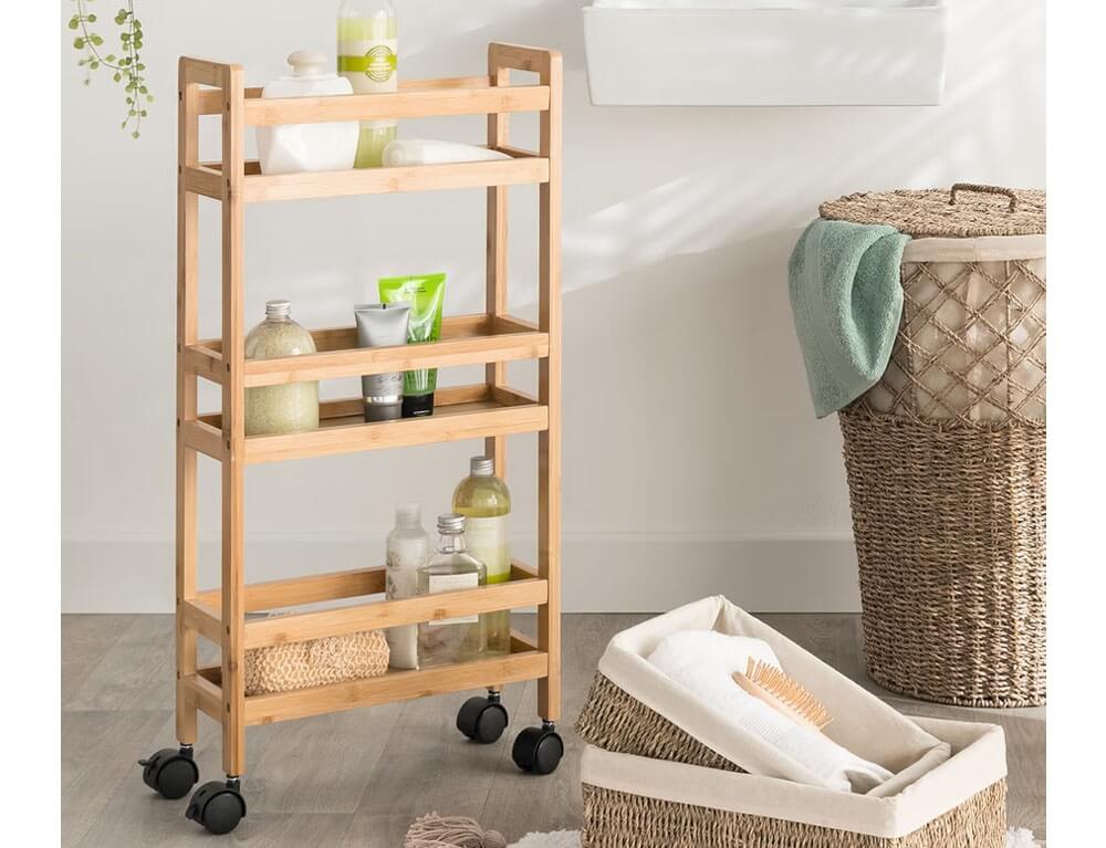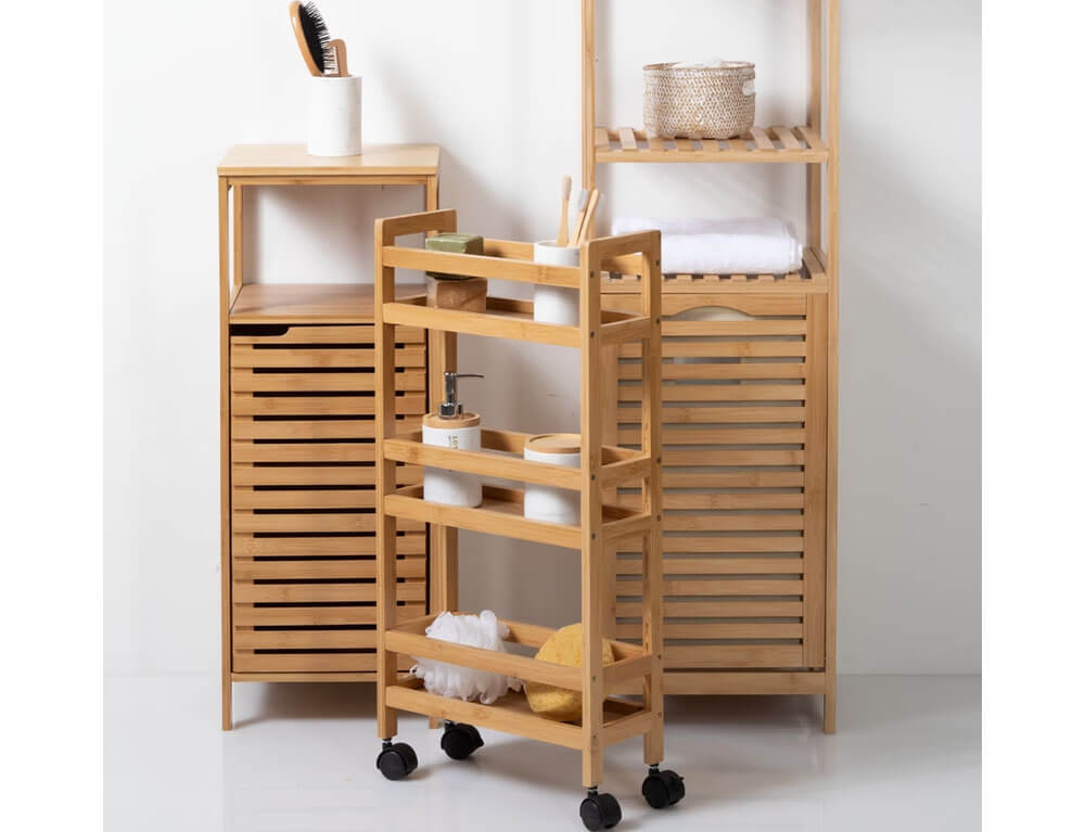 Τρόλευ ή ραφιέρα με 3 ορόφους σε φυσικό χρώμα του ξύλου και κατασκευασμένη από bamboo υλικό. Μπορεί να χρησιμοποιηθεί στην κουζίνα για οργάνωση τροφίμων ή άλλων χρηστικών ειδών, στο μπάνιο για τις πετσέτες, τα σαμπουάν κλπ. Ακόμη μπορεί να τοποθετήθει στο γραφείο για να οργανώσετε τον χώρο σας.