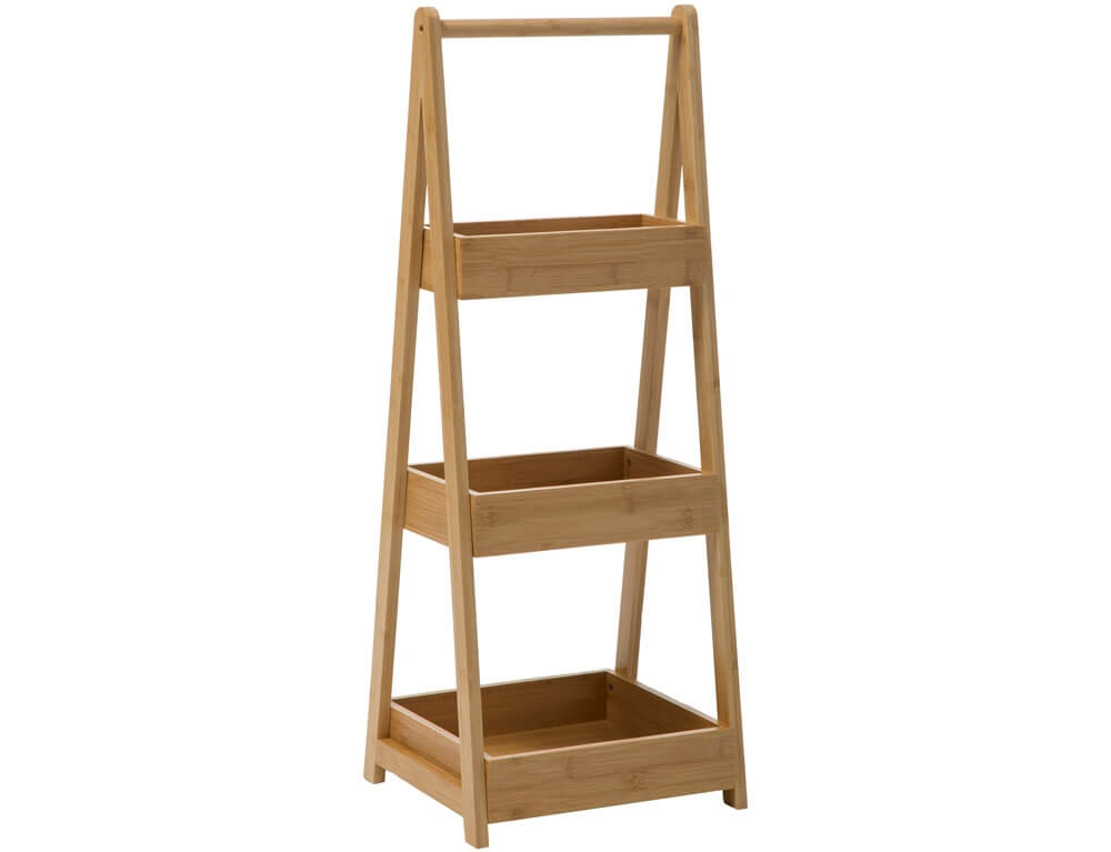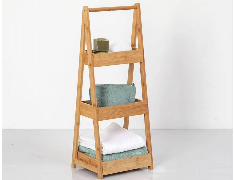 Ραφιέρα δαπέδου με 3 ορόφους για να οργανώσετε τις πετσέτες, τα καλλυντικά ή άλλα μικροπράγματα του μπάνιου σας. Είναι κατασκευασμένη από bamboo και MDF.