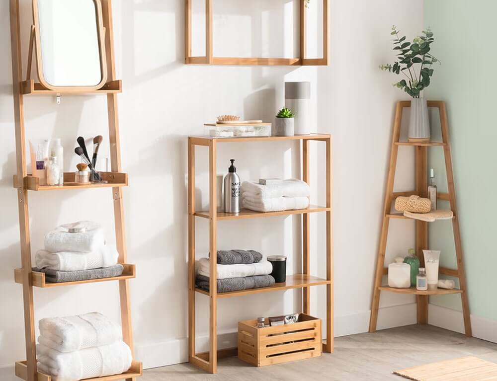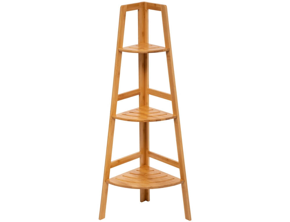 Η ραφιέρα μπάνιου διαθέτει 3 ράφια αποθήκευσης στα οποία μπορείτε να τοποθετήσετε τα προϊόντα της προσωπικής σας περιποίησης, ώστε να έχετε πάντα ένα οργανωμένο και τακτοποιημένο μπάνιο. Μπορείτε να την τοποθετήσετε σε κάποια γωνία του μπάνιου σας και να την στηρίξετε στο δάπεδο. Αυτός ο τρόπος τοποθέτησης είναι πολύ χρήσιμος, καθώς θα εξοικονομήσει χώρο στο μπάνιο σας. Κατασκευάζεται από μπαμπού, το οποίο είναι φιλικό προς το περιβάλλον. Το μπαμπού έχει μεγάλη αντοχή και παραμένει όμορφο για χρόνια.