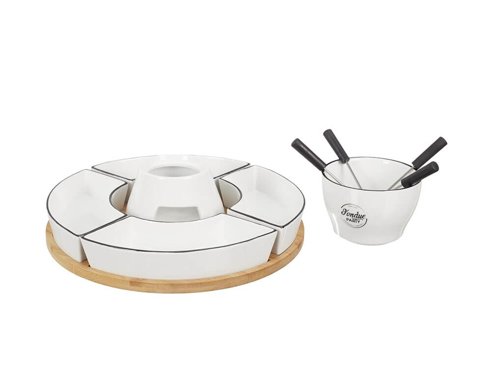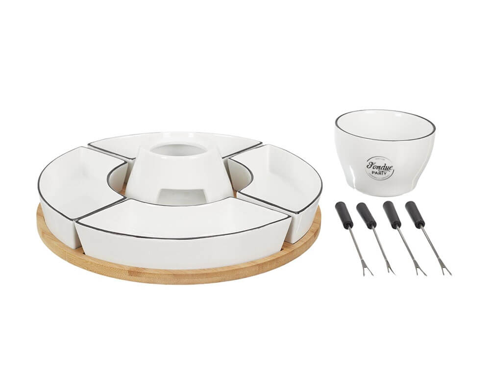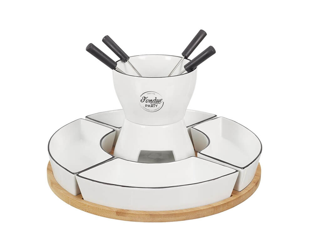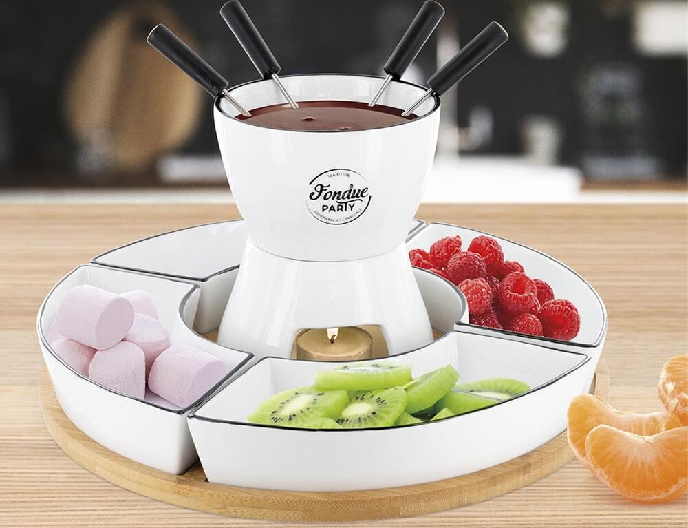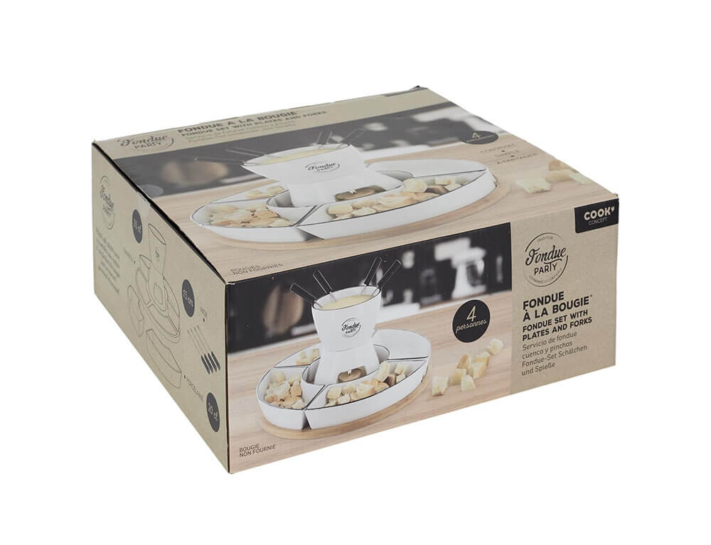 Με τη συσκευή για φοντύ της Cook Concept μπορείτε να απολαύσετε με τους καλεσμένους σας ένα πεντανόστιμο φοντύ είτε ως σνακ είτε ως επιδόρπιο. Διαθέτει κομψό σχεδιασμό και είναι κατασκευασμένο από κεραμικό υλικό και η βάση του είναι από ξύλο μπαμπού. Στη βάση υπάρχουν 4 υποδοχές για μπωλ ώστε να συνοδεύσετε το φοντύ με ότι επιθυμείτε και κάτω από το σκεύος τοποθετείτε ένα κερί για να απολαύσετε όπου και όποτε θέλετε χωρίς να ανησυχείτε για την παροχή ρεύματος. Στη συσκευασία περιλαμβάνονται 4 πηρούνια.