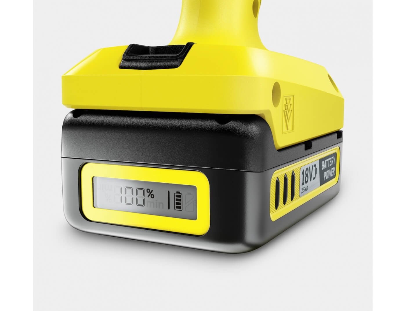Τεχνολογία πραγματικού χρόνου (Real Time) για τη λειτουργία οθόνης LCD στην μπαταρία με τις ακόλουθες ενδείξεις: υπολειπόμενος χρόνος λειτουργίας, υπολειπόμενος χρόνος φόρτισης και χωρητικότητα μπαταρίας. Μεγάλη και ισχυρή χάρη στα κύτταρα ιόντων λιθίου. Συμβατό με όλες τις συσκευές που ανήκουν στην πλατφόρμα μπαταριών 18 V Battery Power της Kärcher.
