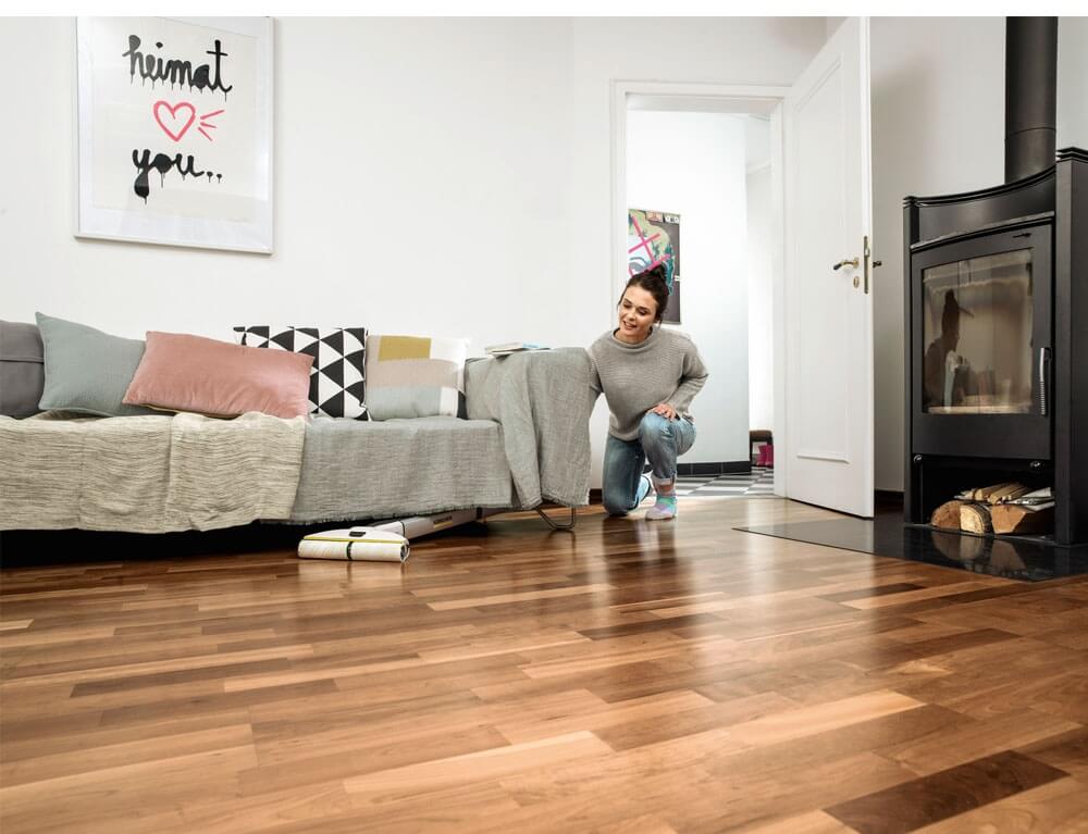 Αφαιρεί λεκέδες και πιτσιλιές μέχρι τις άκρες - χωρίς να χρειάζεται κουβάς ή κουραστικό τρίψιμο. Δεν είναι δυνατόν; Σκεφτείτε το ξανά! Η ασύρματη σφουγγαρίστρα EWM 2 με τις δύο δεξαμενές της το κάνει αυτό εφικτό - και τις συμβατικές σφουγγαρίστρες περιττές. Οι περιστρεφόμενοι κύλινδροι διαβρέχονται συνεχώς με φρέσκο νερό, ενώ η συλλεχθείσα βρωμιά καταλήγει στη δεξαμενή λυμάτων. Η συσκευή αφήνει τα δάπεδα έως και 20% καθαρότερα από τις συμβατικές σφουγγαρίστρες. Χάρη στο λεπτό σχήμα του και την ευέλικτη περιστρεφόμενη άρθρωση, η EWM 2 όχι μόνο φτάνει εύκολα κάτω από τα έπιπλα, αλλά εξοικονομεί και αποθηκευτικό χώρο. Ο χρόνος στεγνώματος του δαπέδου είναι μόνο περίπου δύο λεπτά, καθιστώντας το απόλυτα κατάλληλο για χρήση σε όλους τους τύπους σκληρών δαπέδων (π.χ. πλακάκια, παρκέ, laminate, PVC και βινύλιο). Η ισχυρή μπαταρία ιόντων λιθίου έχει χρόνο λειτουργίας περίπου 20 λεπτά. Αυτό σου επιτρέπει να καθαρίσεις με τη συσκευή έως και 60 m² δαπέδου.