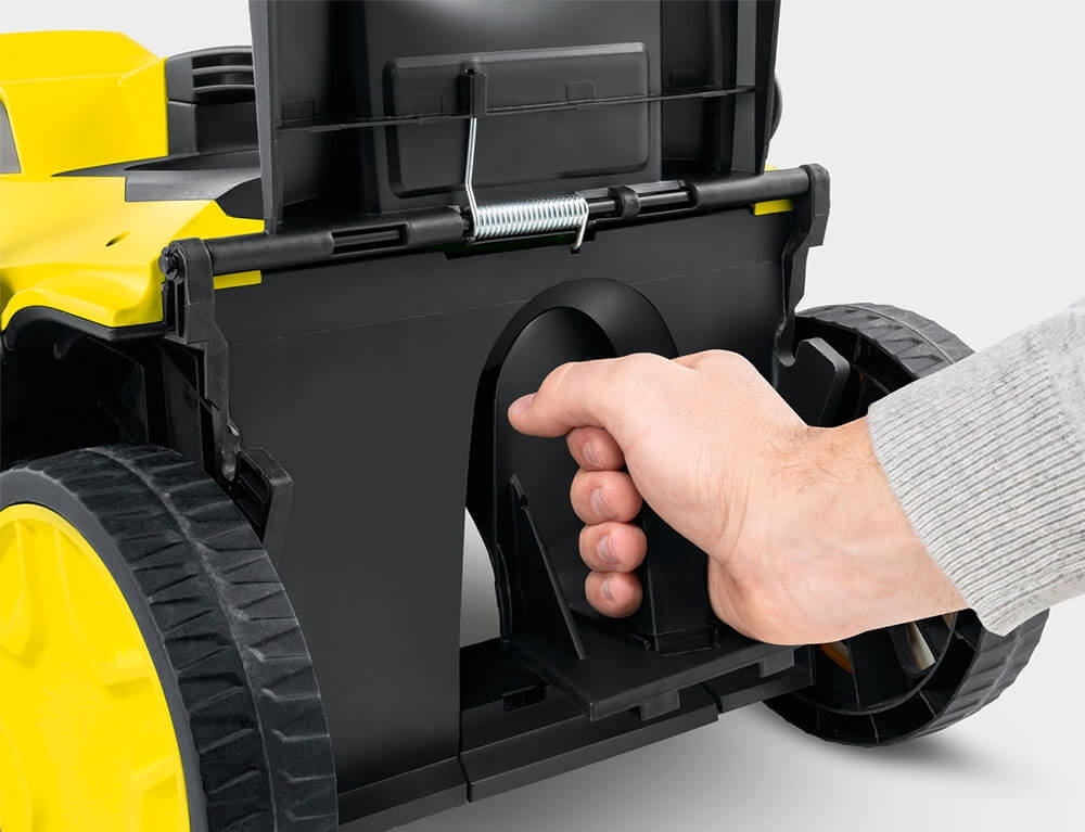 Η πτυσσόμενη λαβή οδηγού επιτρέπει την αποθήκευση με εξοικονόμηση χώρου. Το υφασμάτινο δοχείο συλλογής μπορεί να διπλωθεί σε εξαιρετικά μικρό μέγεθος και καταλαμβάνει ελάχιστο χώρο όταν είναι τοποθετημένο στη χλοοκοπτική μηχανή.
