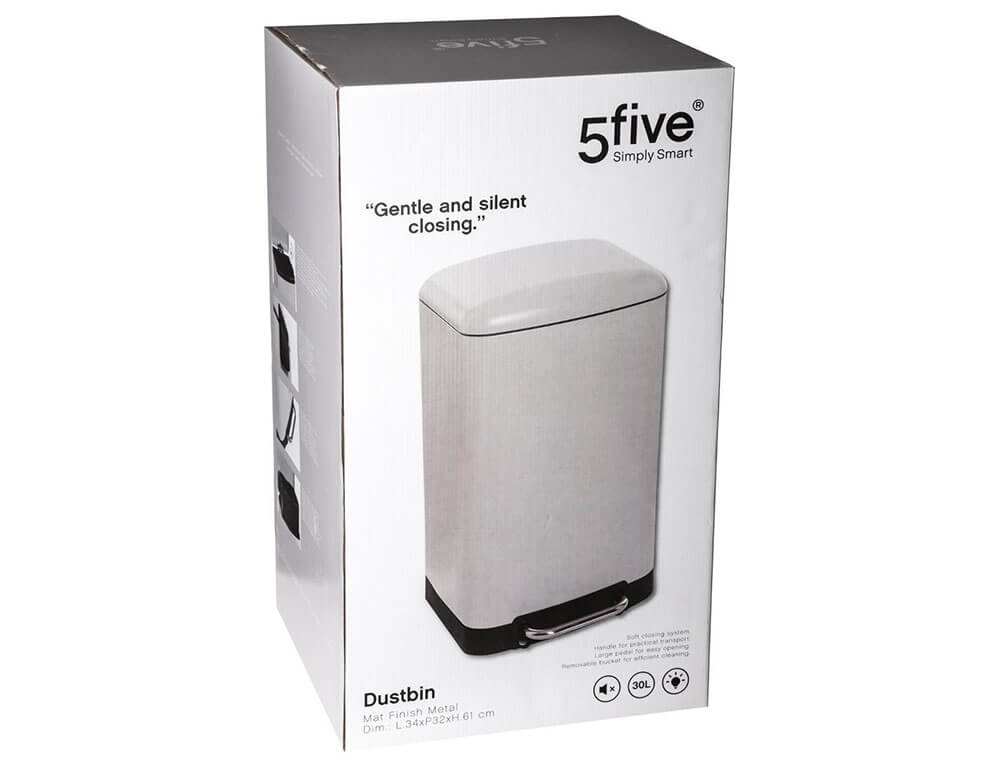 Kάδος απορριμάτων από τη 5five με χωρητικότητα 30 λίτρα. Είναι κατασκευασμένος από μέταλλο, διαθέτει ανθεκτική κατασκευή με πεντάλ και καπάκι που κλείνει αργά χωρίς να προκαλεί θόρυβο. Εσωτερικά διαθέτει πλαστικό κάδο που αφαιρείται εύκολα, ώστε να τον πλένετε και να τον επανατοποθετείτε. Προτείνεται χρήση σακούλας 50lt και στο πίσω μέρος διαθέτει λαβή για πιο εύκολη μεταφορά.