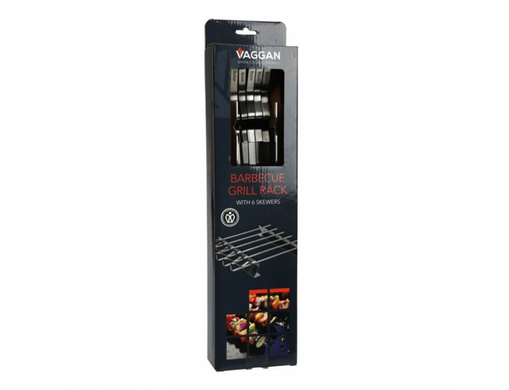 Η σχάρα BBQ Vaggan με τις 2 βάσεις και τα 6 μεταλλικά σουβλάκια είναι η ιδανική επιλογή για το επόμενο μπάρμπεκιου σας. Κατασκευασμένη από ανοξείδωτο ατσάλι, έχει διαστάσεις 42.5 x 10.2 x 1.8εκ που την καθιστούν ανθεκτική και λειτουργική. Με αυτήν τη σχάρα, μπορείτε να ψήσετε εύκολα και γρήγορα τα αγαπημένα σας φαγητά υπό τον ανοιχτό ουρανό. Ετοιμαστείτε για ατελείωτες στιγμές χαράς και γευστικών απολαύσεων με τους φίλους και την οικογένεια σας!