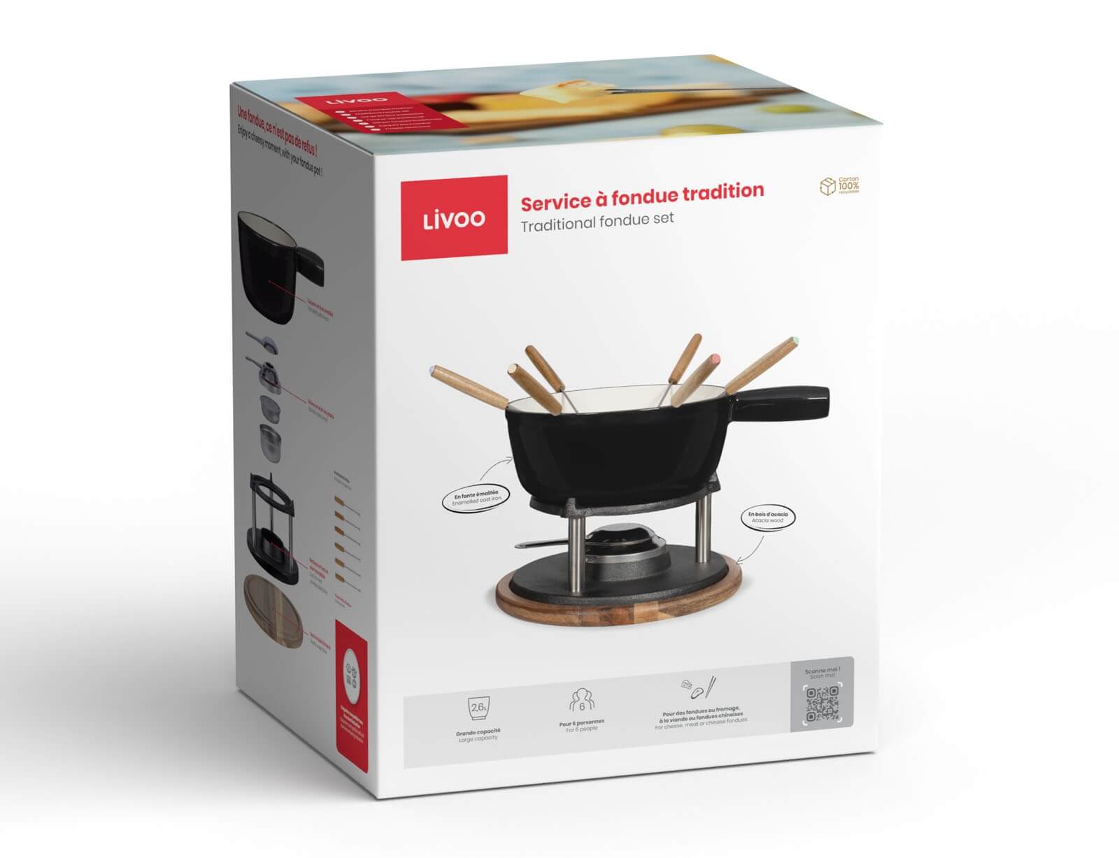 Με τη συσκευή για φοντύ της εταιρείας Livoo μπορείτε να απολαύσετε με τους καλεσμένους σας ένα πεντανόστιμο φοντύ είτε ως σνακ είτε ως επιδόρπιο. Διαθέτει χωρητικότητα 2.6 λίτρα και 6 πιρούνια με ξύλινη λαβή. Το caquelon είναι κατασκευασμένο από σμαλτωμένο χυτοσίδηρο και διαθέτει  βάση από ξύλο ακακίας για ανθεκτικότητα και αισθητική.