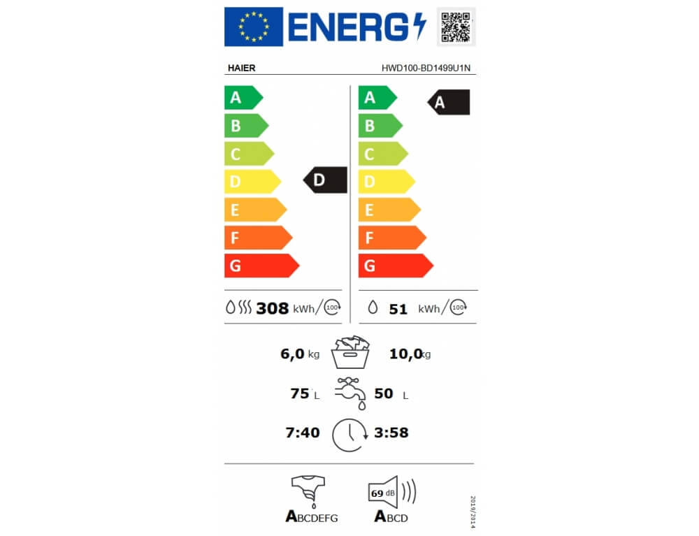 Αυτό το πλυντήριο-στεγνωτήριο, χρησιμοποιώντας μόνο τον κύκλο πλύσης, ανήκει στην κατηγορία Α. Σύμφωνα με τη Νέα Ενεργειακή Σήμανση και σε σύγκριση με την κατηγορία G, το πλυντήριο-στεγνωτήριο κατηγορίας Α μειώνει την κατανάλωση έως και 51%, επιτρέποντάς σας να εξοικονομήσετε ενέργεια, χρήματα και σεβασμό στο περιβάλλον.
