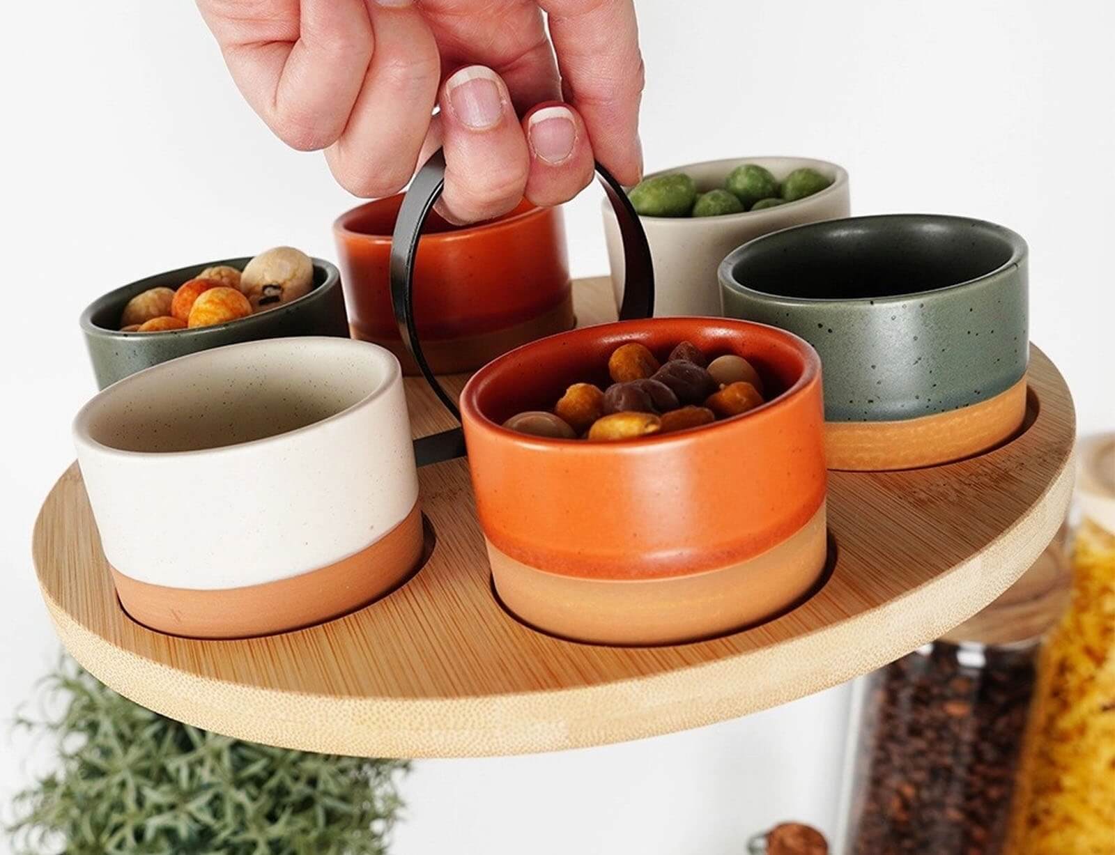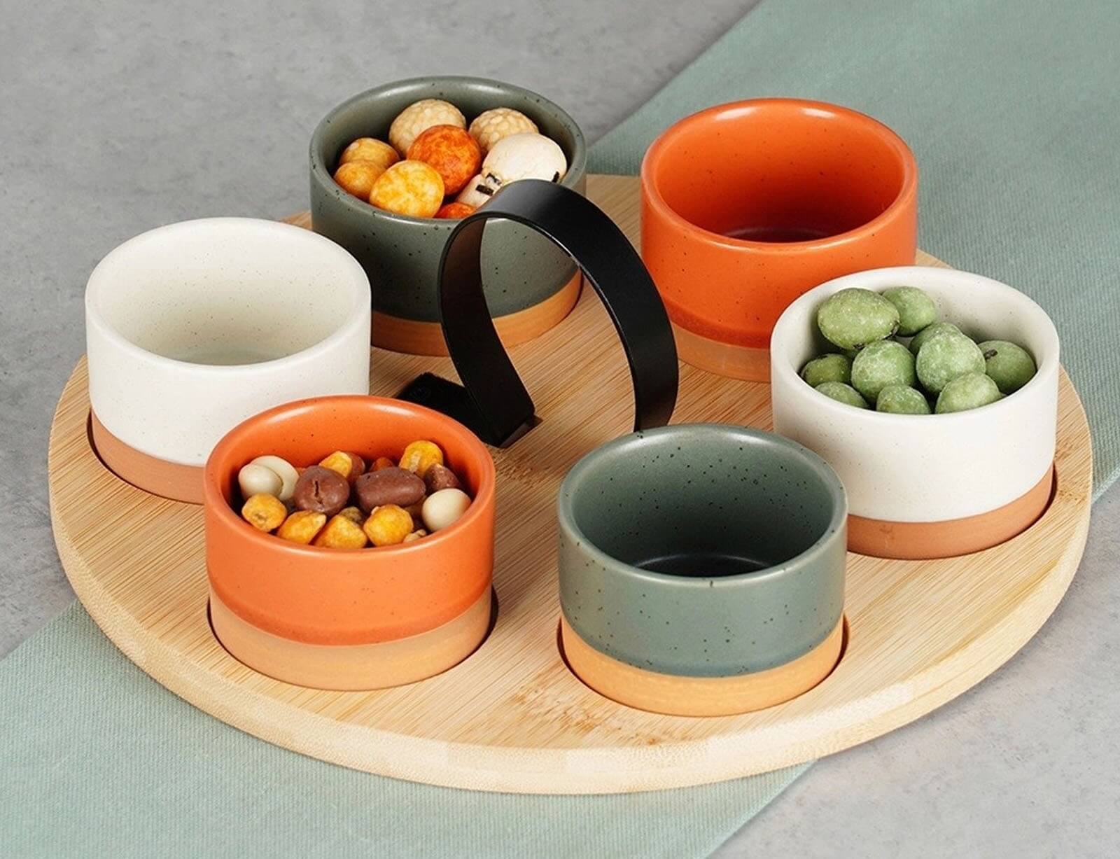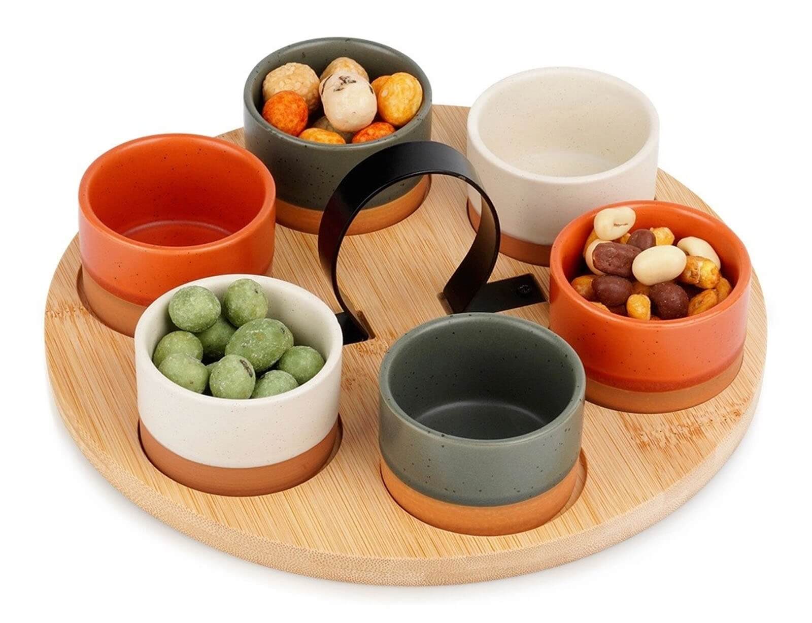 Σερβίρετε τα αγαπημένα σας σνακ ή σάλτσες με το σετ σερβιρίσματος από την Excellent Houseware. Το σετ αποτελείται από 6 μπολ διαφορετικών μεγεθών σε αποχρώσεις τερακότας, γκρι και λευκό και έναν ξύλινο δίσκο. Ο δίσκος διαθέτει εσοχές για να παραμένουν σταθερά τα μπολ και λαβή για να τον μεταφέρετε πιο εύκολα και σταθερά. Τα μπολ είναι κατασκευασμένα από κεραμικό υλικό και ο δίσκος από ξύλο μπαμπού.