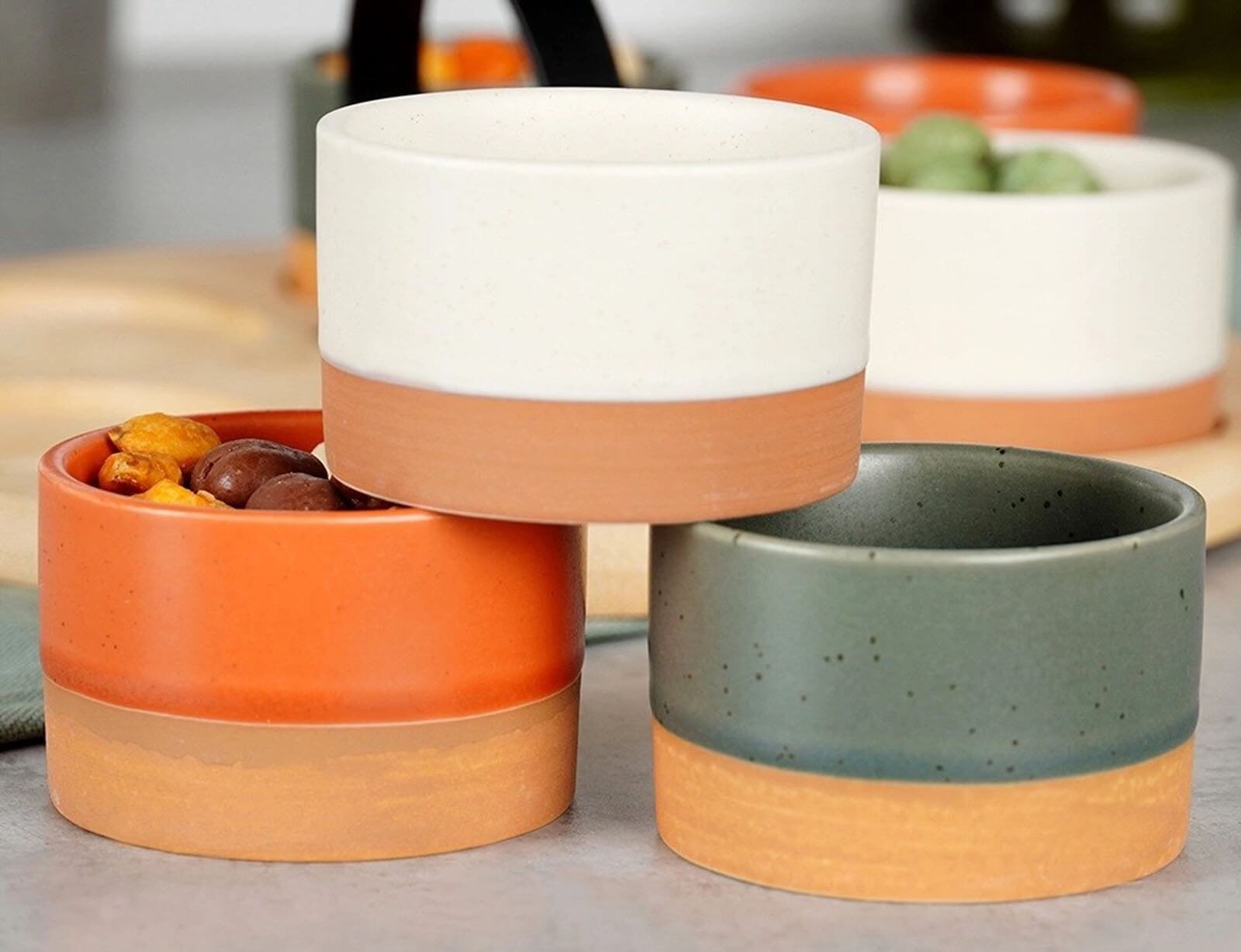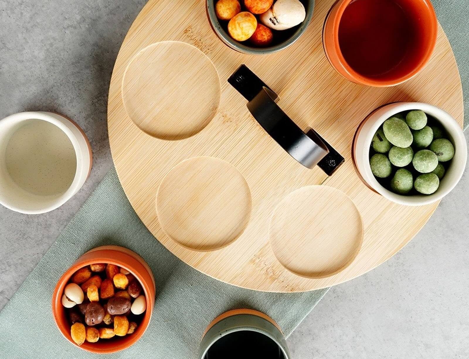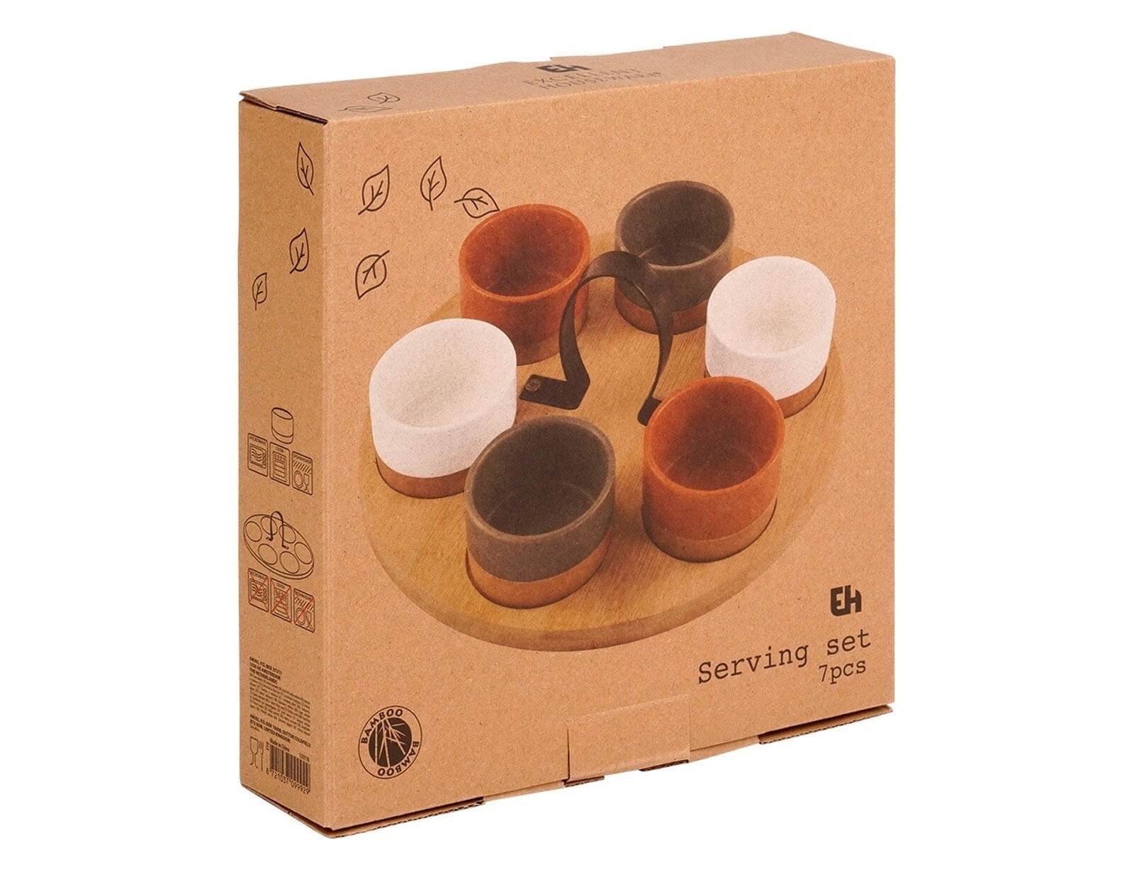 Σερβίρετε τα αγαπημένα σας σνακ ή σάλτσες με το σετ σερβιρίσματος από την Excellent Houseware. Το σετ αποτελείται από 6 μπολ διαφορετικών μεγεθών σε αποχρώσεις τερακότας, γκρι και λευκό και έναν ξύλινο δίσκο. Ο δίσκος διαθέτει εσοχές για να παραμένουν σταθερά τα μπολ και λαβή για να τον μεταφέρετε πιο εύκολα και σταθερά. Τα μπολ είναι κατασκευασμένα από κεραμικό υλικό και ο δίσκος από ξύλο μπαμπού.