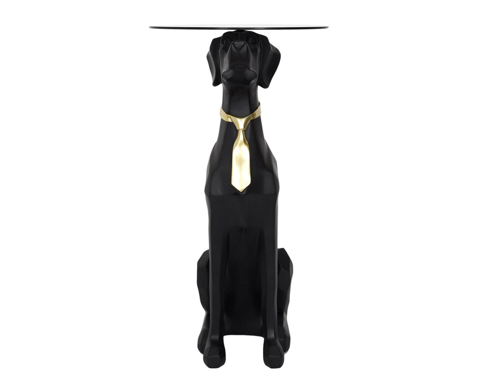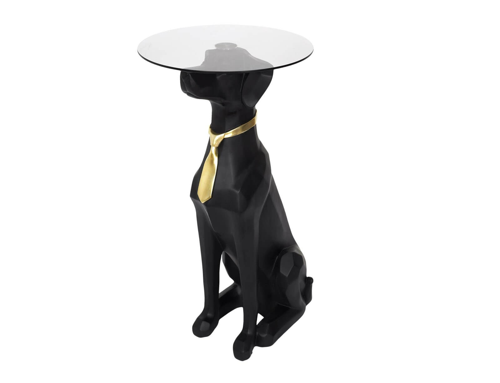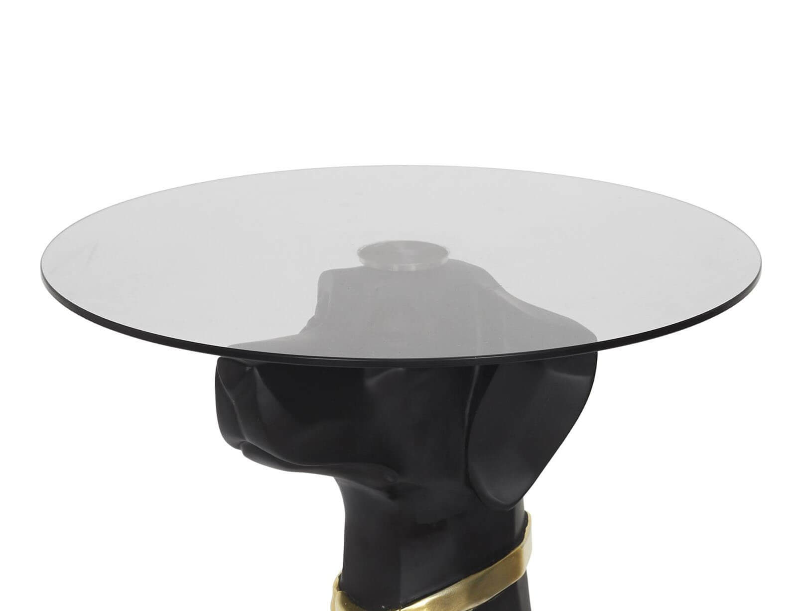 Αναβαθμίστε τη διακόσμηση του χώρου σας με αυτό το εντυπωσιακό και ιδιαίτερο βοηθητικό τραπεζάκι, που συνδυάζει τέχνη, φαντασία και λειτουργικότητα! Ο πρωτότυπος σχεδιασμός του απεικονίζει έναν καθιστό σκύλο με μαύρο ματ φινίρισμα, κομψά διακοσμημένο με χρυσή γραβάτα, δημιουργώντας μια εκκεντρική και ταυτόχρονα πολυτελή πινελιά. Η στρογγυλή γυάλινη επιφάνεια στηρίζεται στο κεφάλι του σκύλου, προσφέροντας σταθερότητα και επαρκή χώρο για ποτά, βιβλία ή διακοσμητικά. Κατασκευασμένο από υψηλής ποιότητας polyresin, αυτό το τραπεζάκι συνδυάζει ανθεκτικότητα και μοναδικό στυλ, κάνοντάς το ιδανικό για κάθε χώρο.