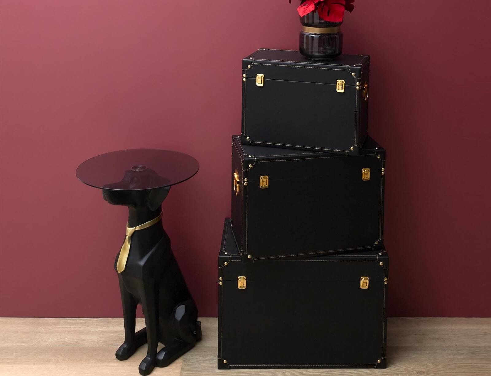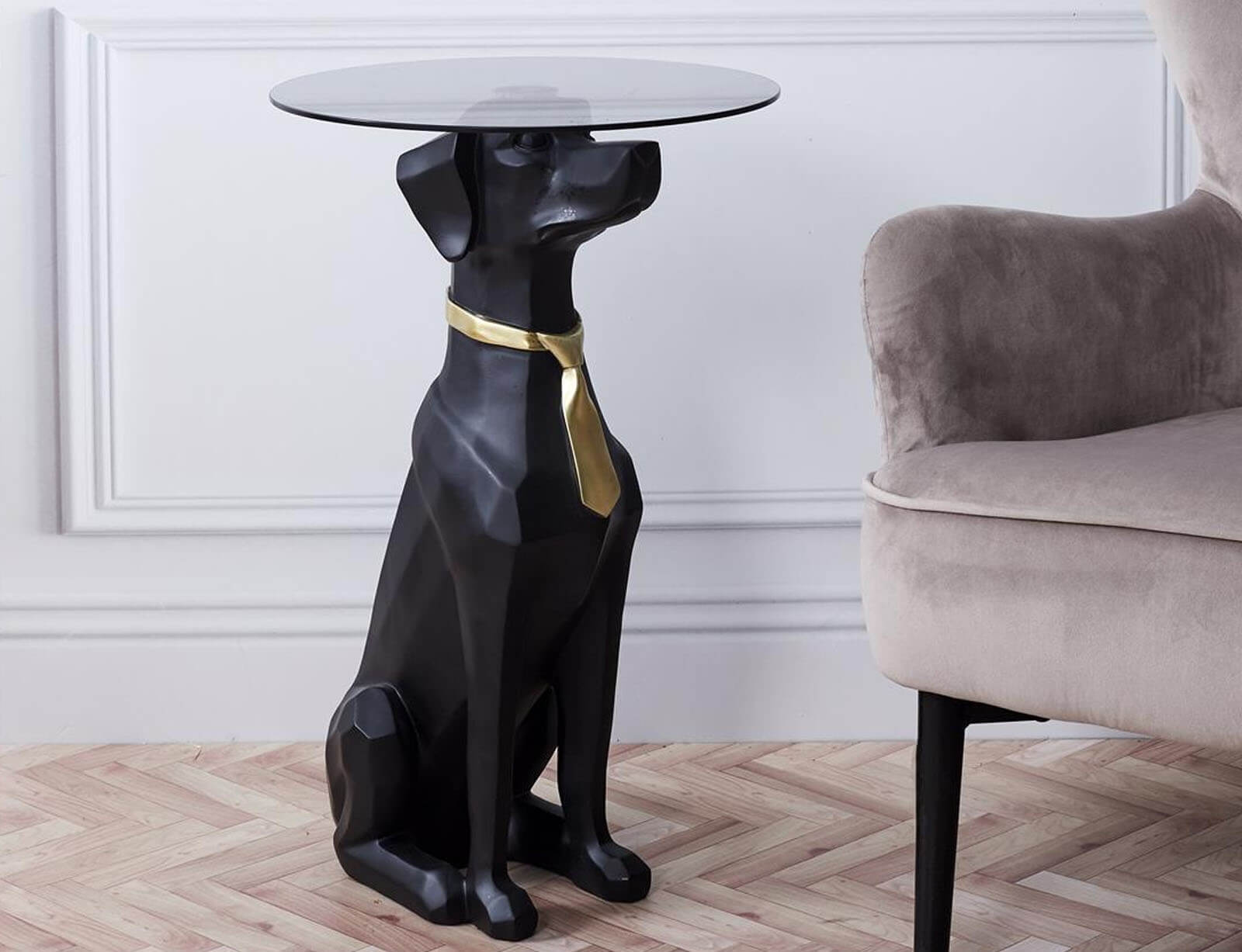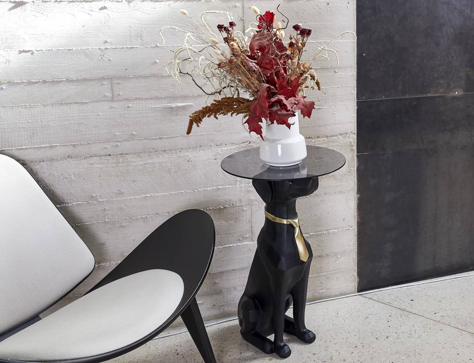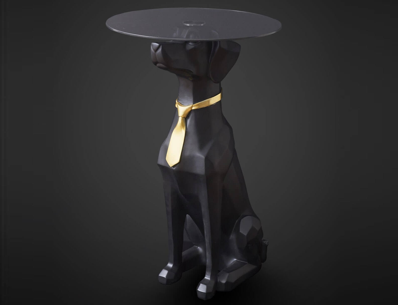 Αναβαθμίστε τη διακόσμηση του χώρου σας με αυτό το εντυπωσιακό και ιδιαίτερο βοηθητικό τραπεζάκι, που συνδυάζει τέχνη, φαντασία και λειτουργικότητα! Ο πρωτότυπος σχεδιασμός του απεικονίζει έναν καθιστό σκύλο με μαύρο ματ φινίρισμα, κομψά διακοσμημένο με χρυσή γραβάτα, δημιουργώντας μια εκκεντρική και ταυτόχρονα πολυτελή πινελιά. Η στρογγυλή γυάλινη επιφάνεια στηρίζεται στο κεφάλι του σκύλου, προσφέροντας σταθερότητα και επαρκή χώρο για ποτά, βιβλία ή διακοσμητικά. Κατασκευασμένο από υψηλής ποιότητας polyresin, αυτό το τραπεζάκι συνδυάζει ανθεκτικότητα και μοναδικό στυλ, κάνοντάς το ιδανικό για κάθε χώρο.