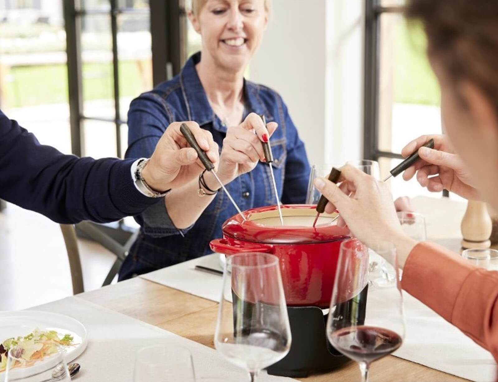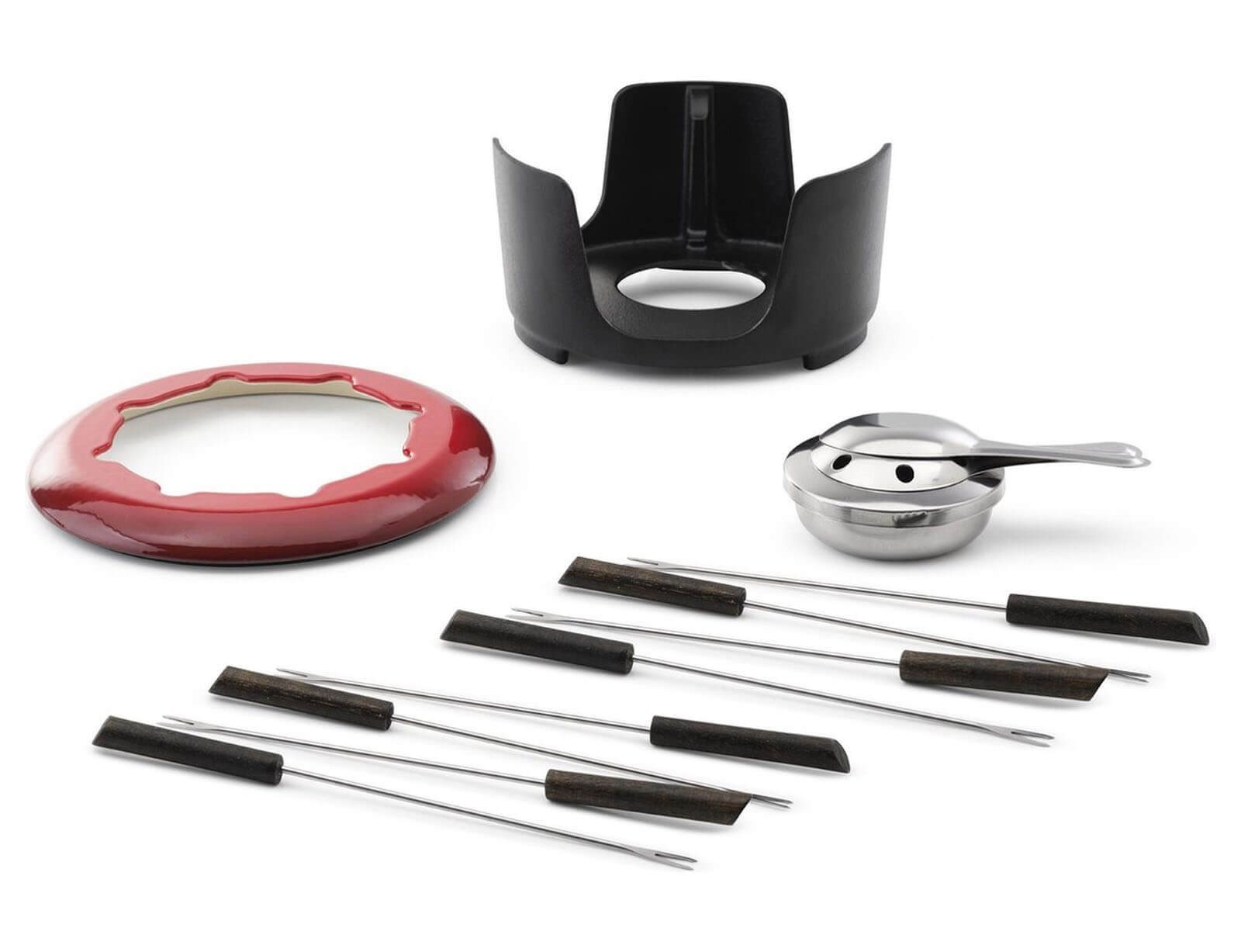 Αναβαθμίστε την εμπειρία του φοντύ σας με το, σχεδιασμένο για απόλαυση, αντοχή και στυλ. Το σετ περιλαμβάνει όλα τα απαραίτητα αξεσουάρ για ένα τέλειο γεύμα φοντύ – εκτός της κατσαρόλας – και είναι κατάλληλο για σκεύη διαμέτρου 20 εκ. Κατασκευασμένο από ανθεκτικό χυτοσίδηρο, προσφέρει εξαιρετική κατανομή και διατήρηση της θερμότητας, ενώ παραμένει ανθεκτικό στις γρατζουνιές και τη φθορά. Το σετ είναι κατάλληλο για όλους τους τύπους εστιών – ακόμη και για επαγωγικές – αλλά και για χρήση στον φούρνο έως 300°C.
