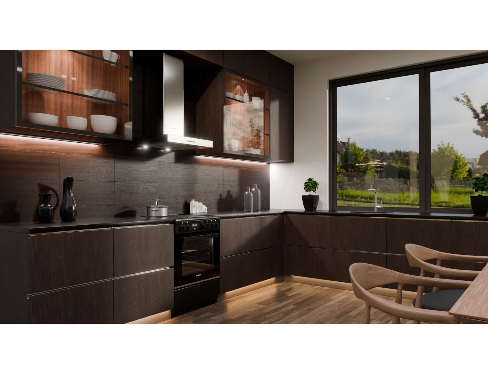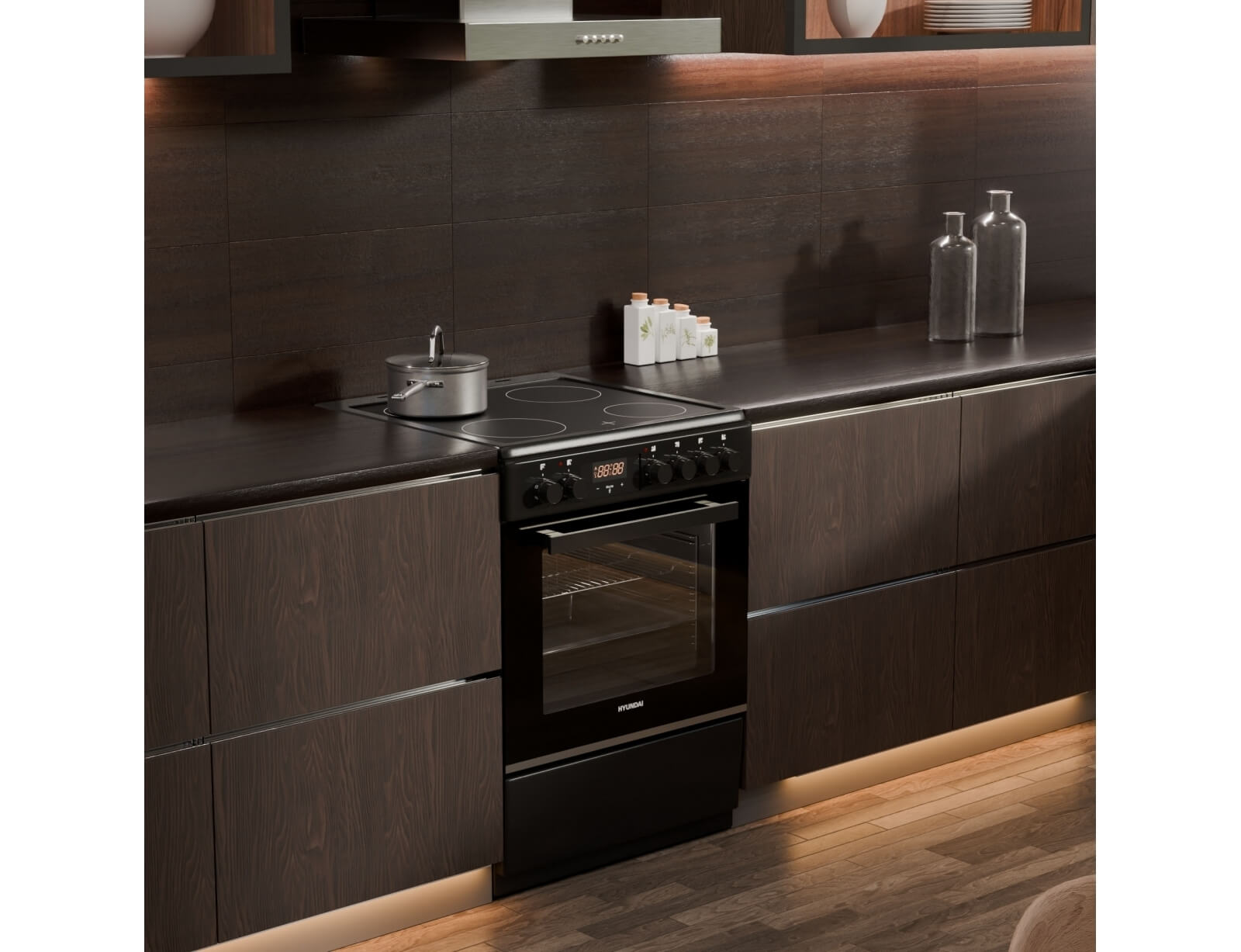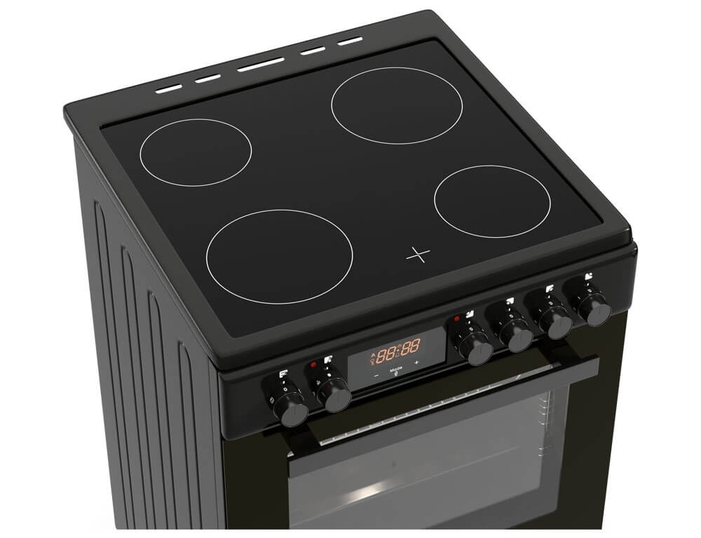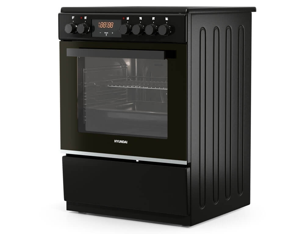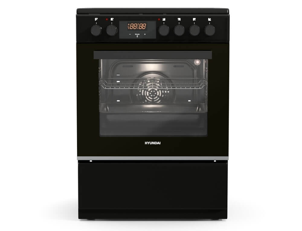 Κουζίνα Hyundai HCVC25V-7261V/BL με μεγάλη χωρητικότητα φούρνου 69 λίτρα, ενεργειακή κλάση Α, 4 κεραμικές εστίες μαγειρέματος και 5 λειτουργίες ψησίματος, σε μαύρο χρώμα.