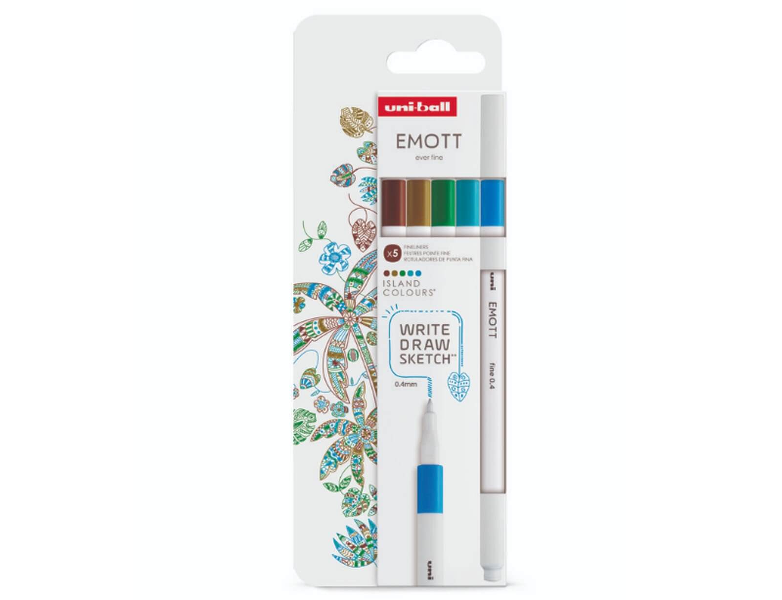 Ζωντανέψτε τις σελίδες σας με το σετ Uni-Ball Emott Island Colours, εμπνευσμένο από την ανεμελιά και τα χρώματα των τροπικών νησιών. Οι 5 μοναδικές αποχρώσεις προσφέρουν φρεσκάδα και αισιοδοξία, ιδανικές για θερινό journaling, καλοκαιρινές σημειώσεις και δημιουργική διακόσμηση. Το σετ προσφέρει εξαιρετική ποιότητα γραφής με ακρίβεια 0,4mm και ανθεκτικό μελάνι που δεν ξεθωριάζει. Ο εργονομικός τετράγωνος σχεδιασμός αποτρέπει την κύλιση, ενώ το μοντέρνο λευκό σώμα προσθέτει μια κομψή αισθητική στο γραφείο ή το δημιουργικό σας περιβάλλον.