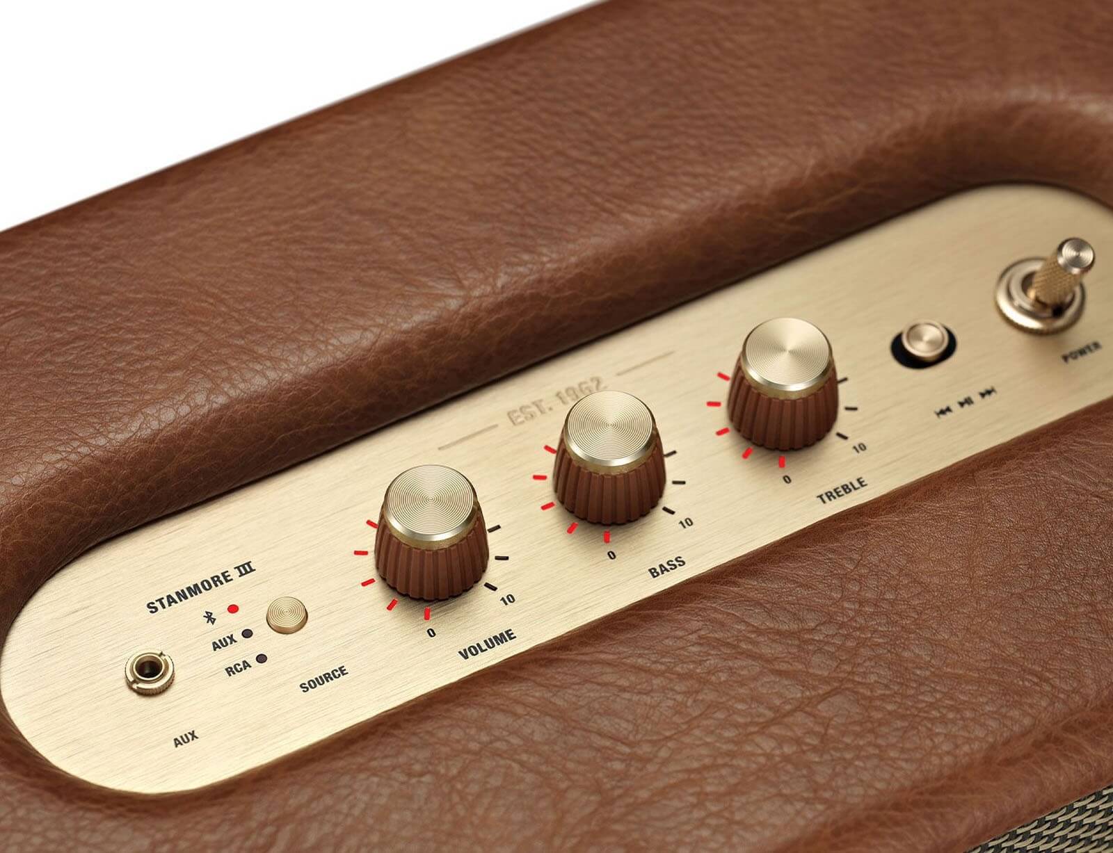 - Χειριστήρια πάνω στο ηχείο: Κουμπί επιλογής πηγής, Ρυθμιστικό έντασης ήχου, Ρυθμιστικό μπάσων, Ρυθμιστικό πρίμων, Κουμπί αναπαραγωγής/παύσης, Ρυθμιστικό παράκαμψης προηγούμενου/επόμενου τραγουδιού, Διακόπτης λειτουργίας