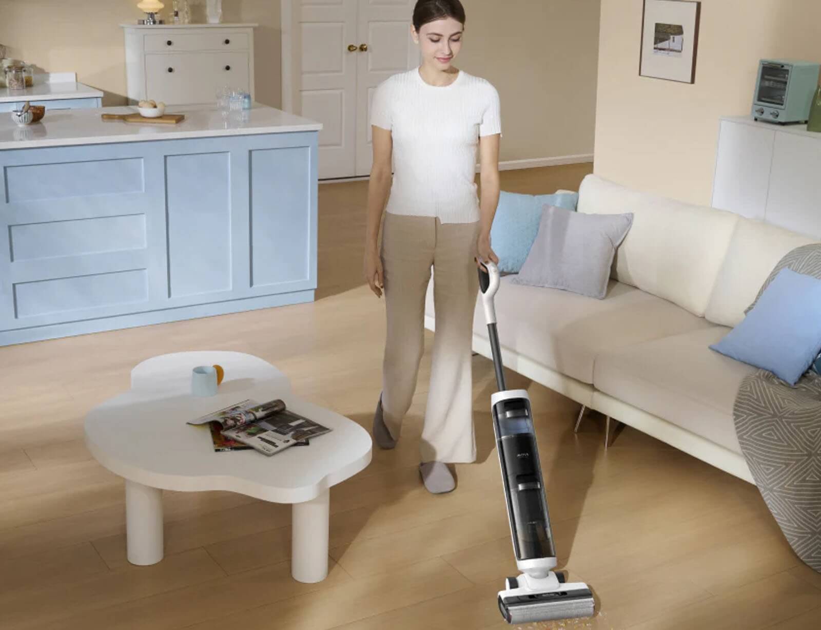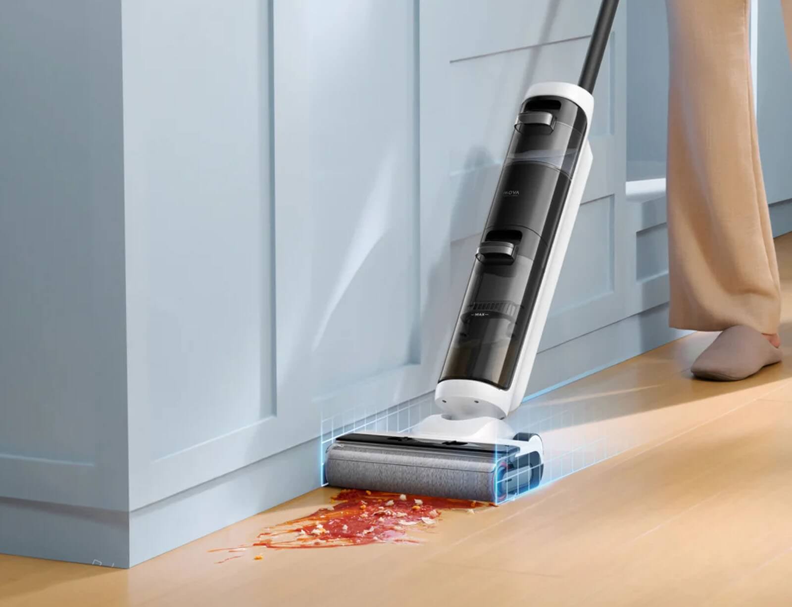 Το K20 προσφέρει ταυτόχρονες λειτουργίες ασύρματης σφουγγαρίσματος και σκούπας, αντιμετωπίζοντας αποτελεσματικά μια ποικιλία υγρών και στεγνών λερωμένων σημείων σε σφραγισμένα σκληρά δάπεδα. Η ικανότητα αναρρόφησης προσαρμόζεται έξυπνα στο επίπεδο βρωμιάς στο δάπεδο για να εξασφαλίσει αποτελεσματικό καθαρισμό.