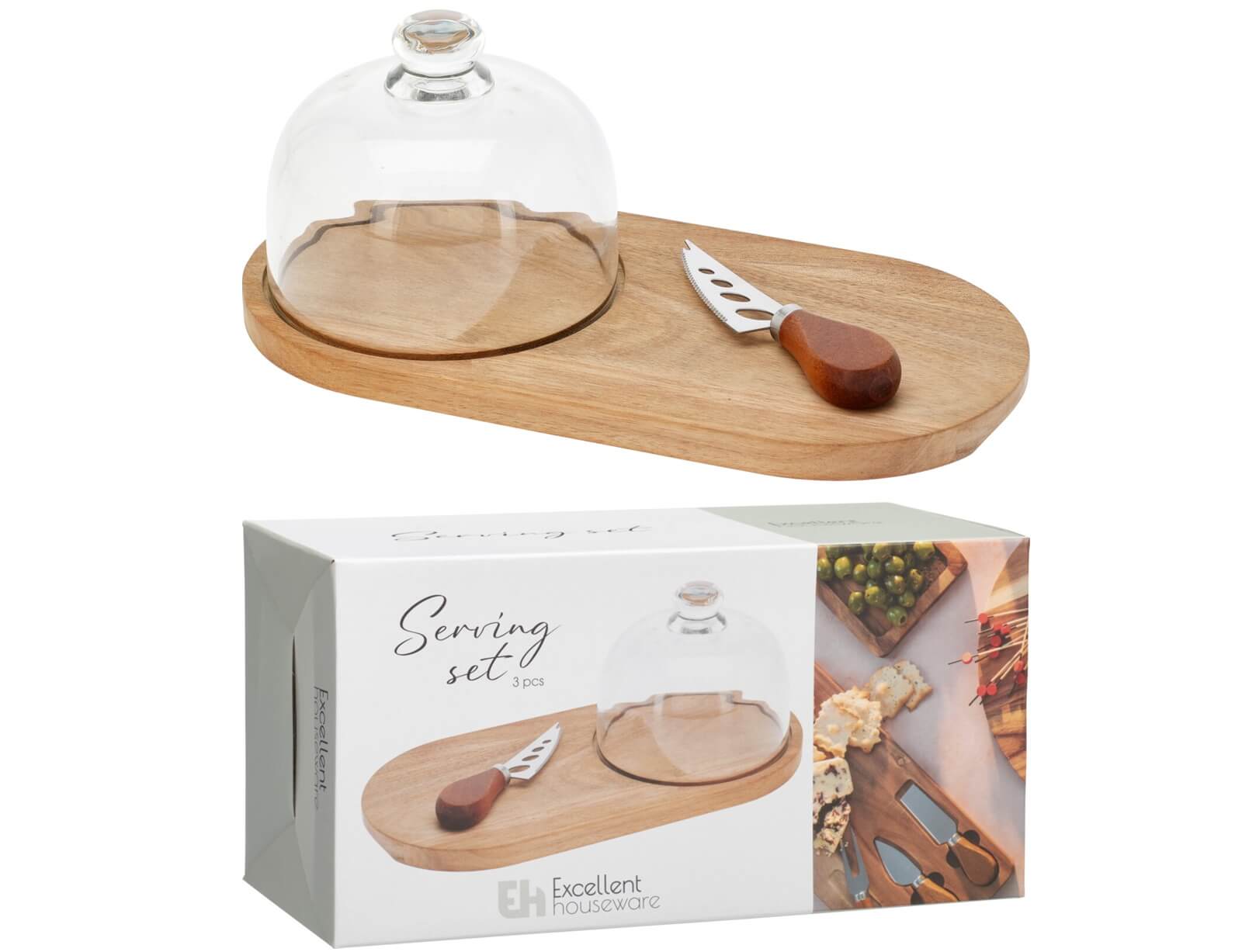 Κομψό και πρακτικό σετ σερβιρίσματος 3 τεμαχίων, ιδανικό για τυριά και ορεκτικά. Περιλαμβάνει δίσκο από ξύλο ακακίας, γυάλινο καπάκι για προστασία και διατήρηση της φρεσκάδας, καθώς και μαχαίρι τυριού από ανοξείδωτο ατσάλι με λαβή ακακίας. Ο διαχρονικός σχεδιασμός και τα ποιοτικά υλικά το καθιστούν ιδανική επιλογή για καθημερινή χρήση αλλά και για εντυπωσιακό σερβίρισμα σε τραπέζια και μπουφέδες.