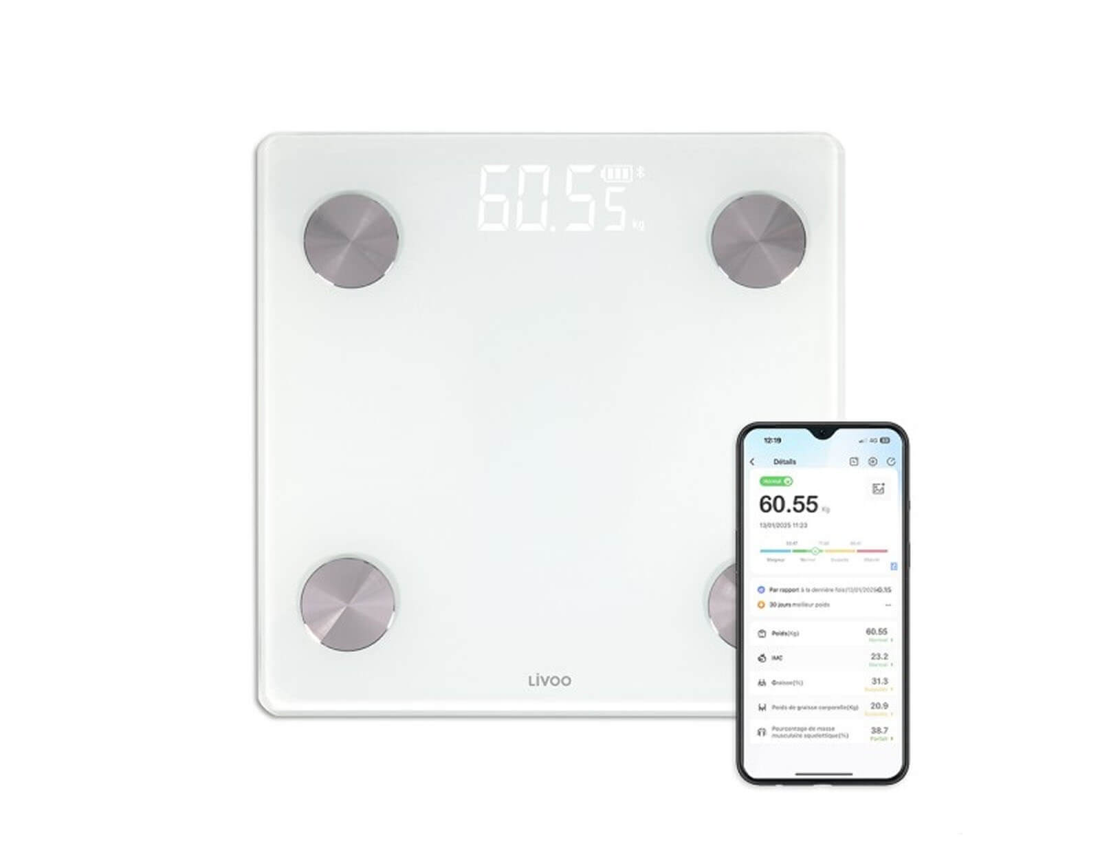 - 17 δείκτες σώματος: ΔΜΣ, BMR, λιπώδης μάζα, σπλαχνικό λίπος, οστική μάζα, μάζα νερού, μυϊκή μάζα, πρωτεΐνη, ηλικία σώματος, κ.λπ.