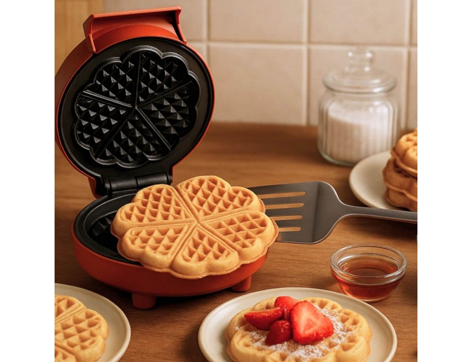 Η βαφλιέρα Livoo DOP255R διαθέτει ισχύ 1000 W και αυτόματο θερμοστάτη, επιτρέποντας το ψήσιμο 5 βαφλών σε σχήμα καρδιάς ταυτόχρονα. Η αντικολλητική επίστρωση εξασφαλίζει εύκολη αφαίρεση των βαφλών από το καλούπι, ενώ η θερμοανθεκτική λαβή και τα αντιολισθητικά πόδια εξασφαλίζουν ασφαλή χρήση.