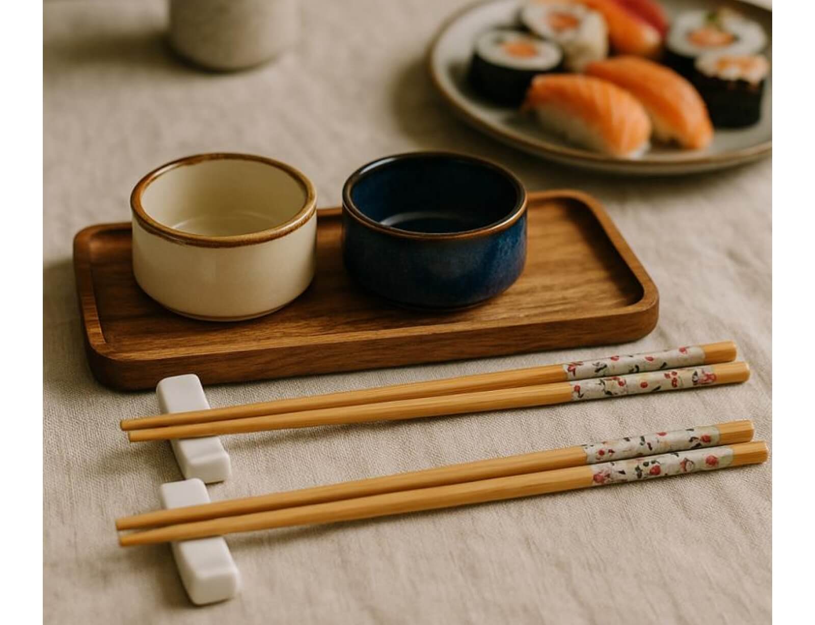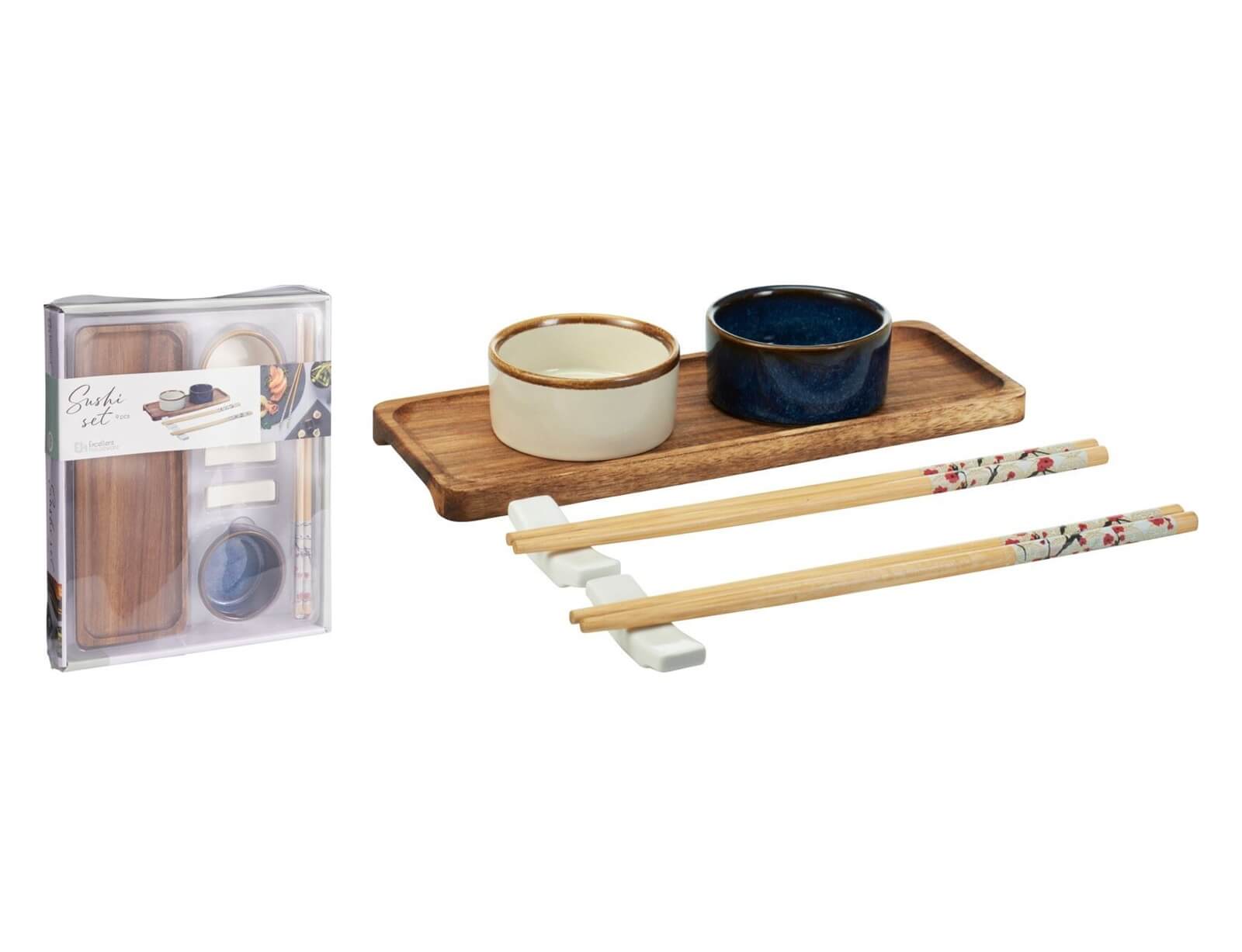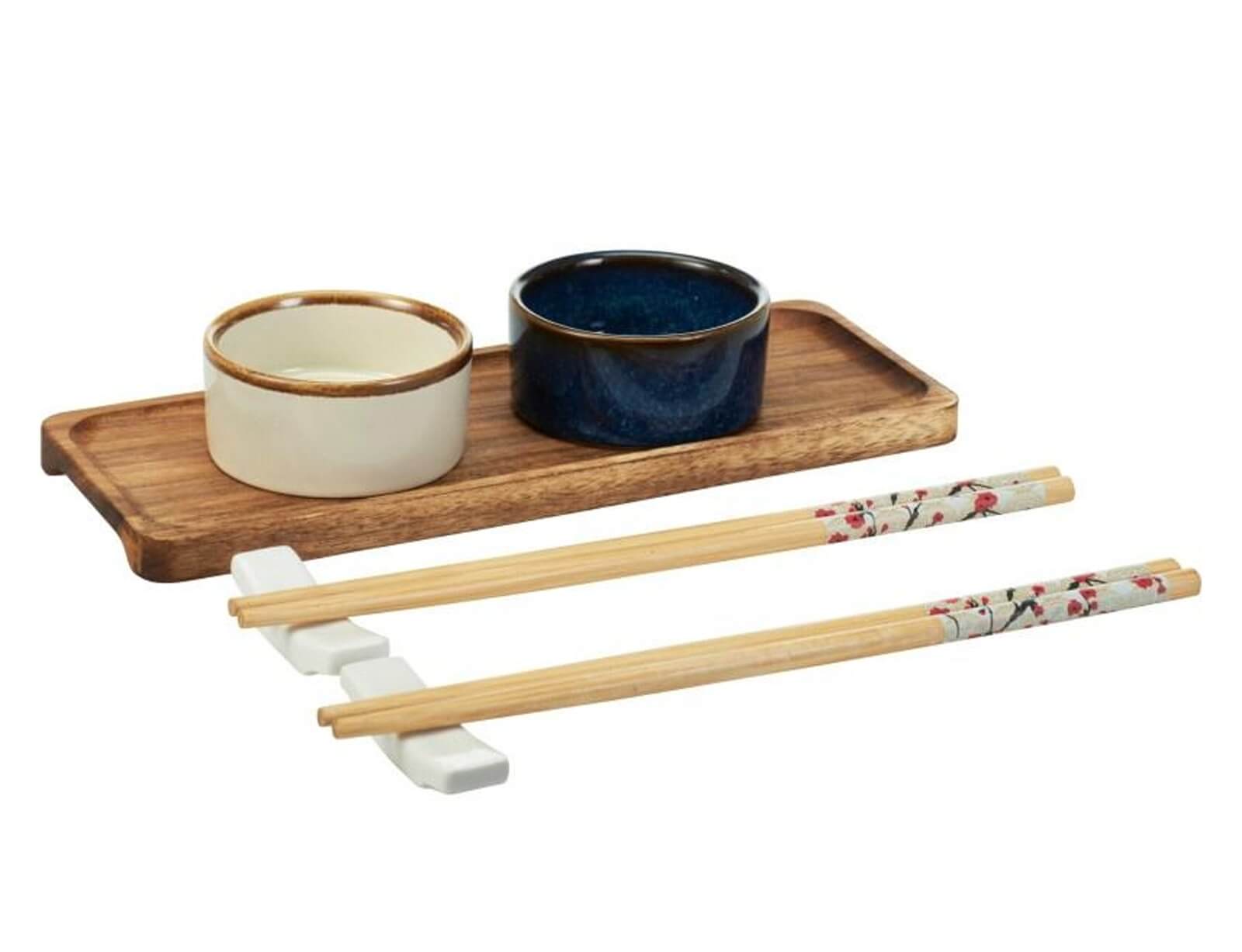 Το σετ σερβιρίσματος Sushi από την Excellent Houseware είναι το ιδανικό εργαλείο για να απολαύσετε τις αυθεντικές γεύσεις του σούσι στο σπίτι σας, με κομψότητα και λειτουργικότητα. Ο δίσκος σερβιρίσματος είναι από ξύλο ακακίας, τα μπολ και οι βάσεις είναι φταγμένα από πορσελάνη ενώ τα chopsticks από ξύλο μπαμπού. Ιδανικό για ρομαντικά δείπνα, γιορτές ή ακόμα και καθημερινές στιγμές απόλαυσης, αυτό το σετ θα μετατρέψει κάθε γεύμα σε μια μοναδική εμπειρία.