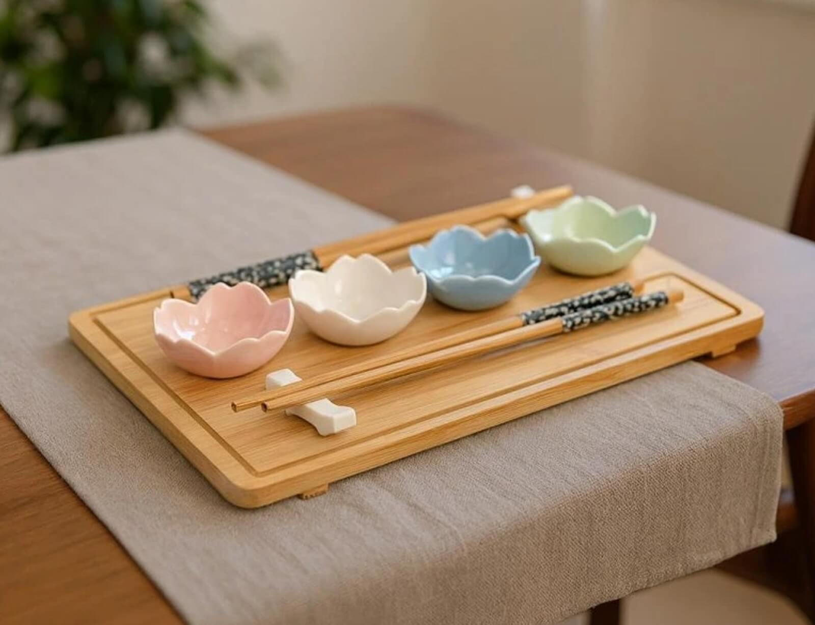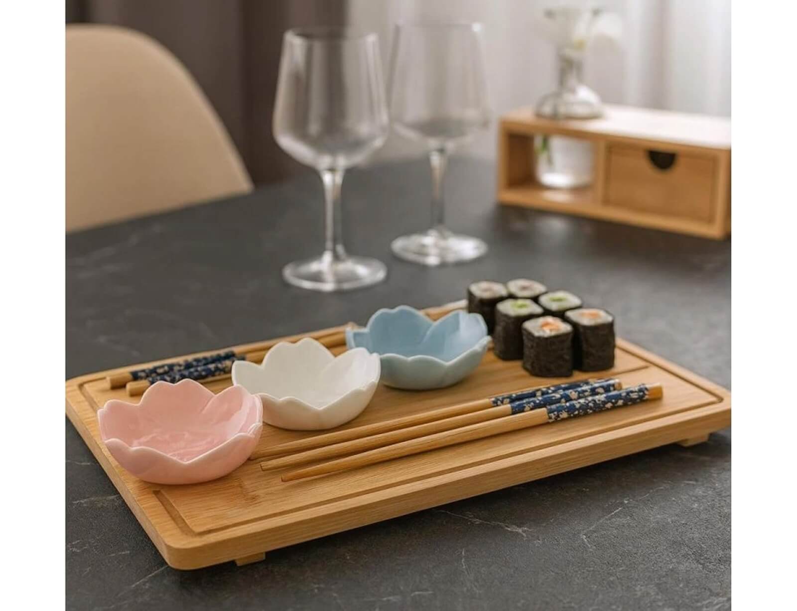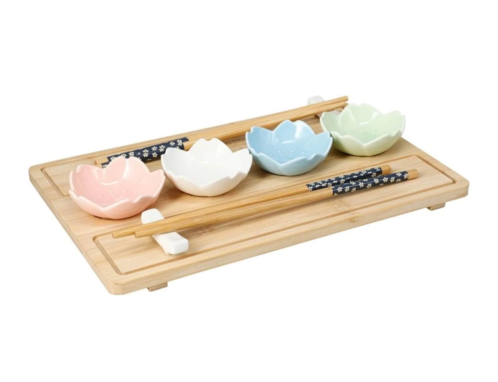 Το σετ σερβιρίσματος Sushi από την Excellent Houseware είναι το ιδανικό εργαλείο για να απολαύσετε τις αυθεντικές γεύσεις του σούσι στο σπίτι σας, με κομψότητα και λειτουργικότητα. Ο δίσκος είναι από ξύλο μπαμπού, ενώ περιλαμβάνονται και 4 πορσελάνινα μπολ σχήματος λουλουδιού σε διαφορετικά χρώματα. Ιδανικό για ρομαντικά δείπνα, γιορτές ή ακόμα και καθημερινές στιγμές απόλαυσης, αυτό το σετ θα μετατρέψει κάθε γεύμα σε μια μοναδική εμπειρία.