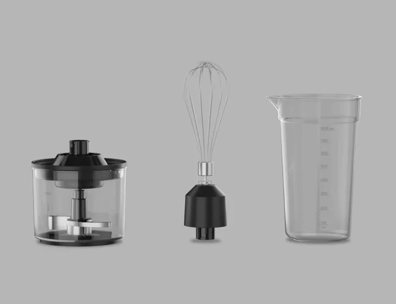 Μετατρέψτε το χειροκίνητο μπλέντερ σας σε μια πολυλειτουργική, ισχυρή συσκευή κουζίνας. Με τα συνοδευτικά εξαρτήματα — κάδο κοπής (500 ml), χτυπητήρι και δοσομετρικό δοχείο (800 ml) — μπορείτε εύκολα να εναλλάσσετε ανάμεσα στο κόψιμο, το χτύπημα, την ανάμειξη και πολλά ακόμα. Ένα εργαλείο, αμέτρητες δυνατότητες — ιδανικό για κάθε ανάγκη μαγειρέματος και ζαχαροπλαστικής.